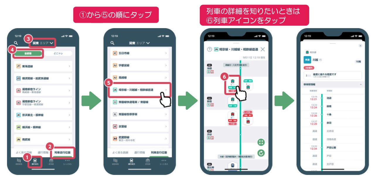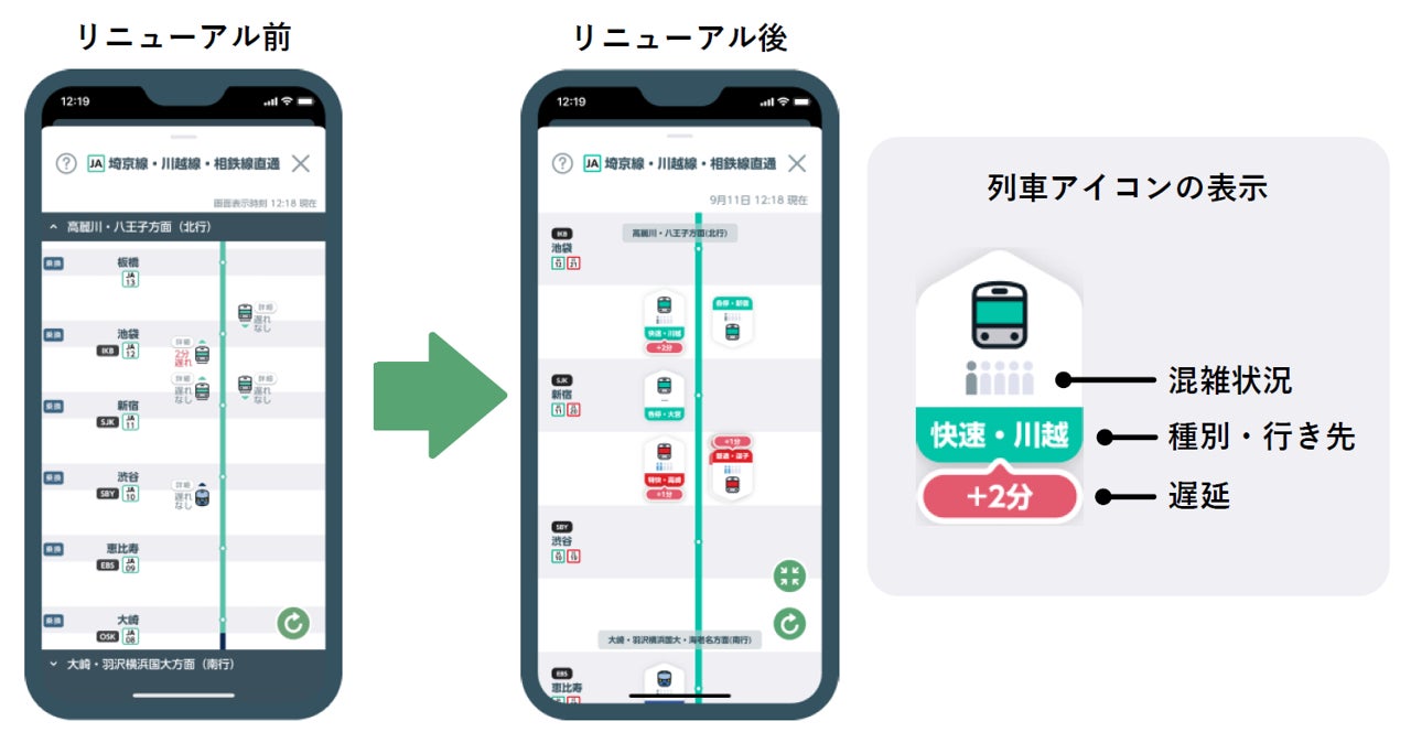 リアルタイムの列車走行位置や遅延状況に加え、混雑状況も列車ごとに確認できます。さらに各列車の種別・行き先の情報もまとめて確認できるようになります。