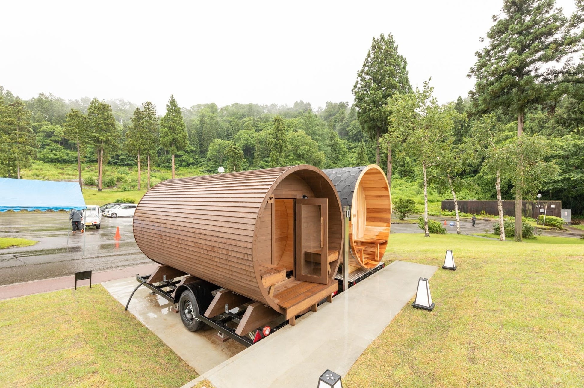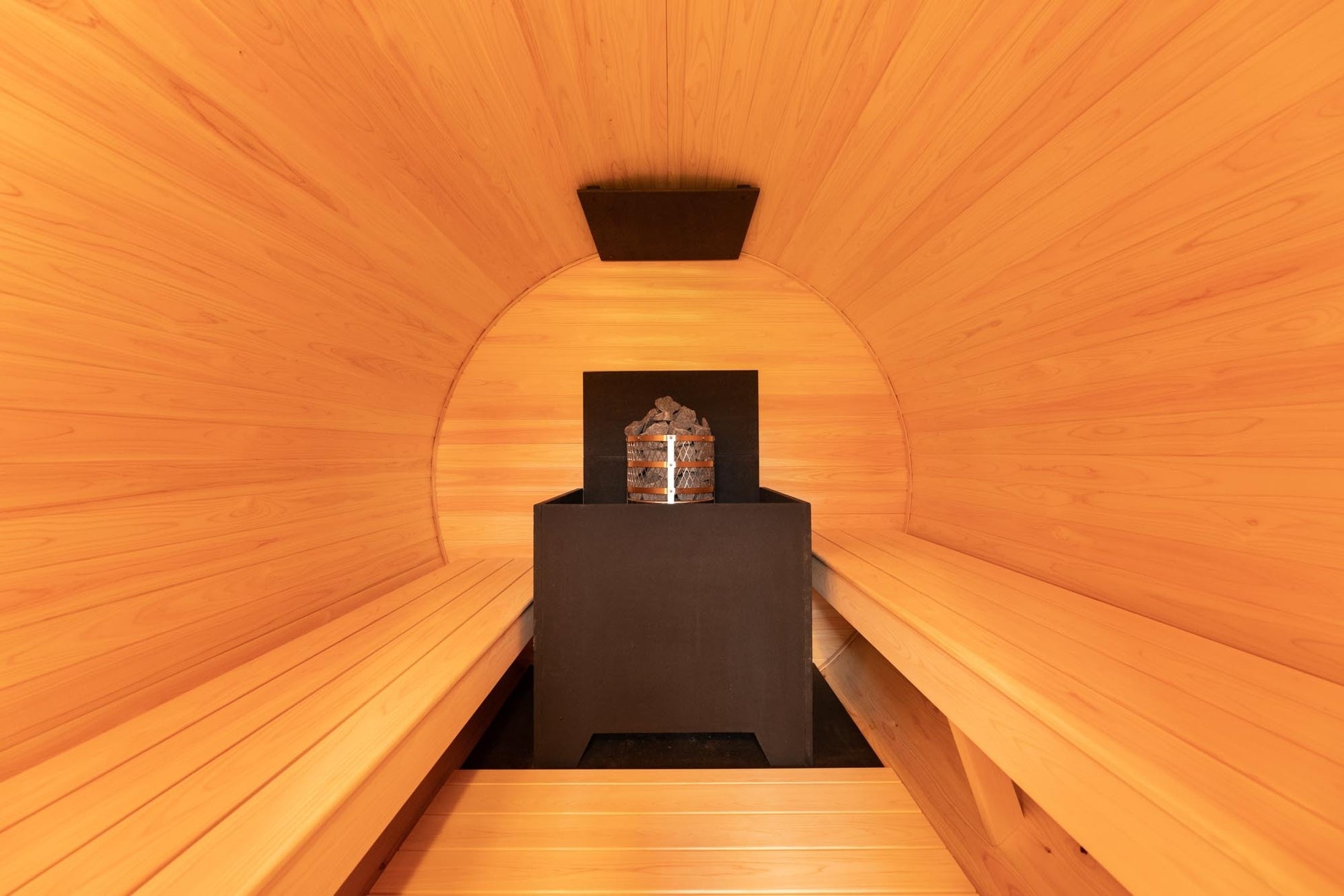 プールサイドには室内から妙高山を見通せる国産ヒノキ製・海外レッドシダー製と異なる仕様のバレルサウナを2基設置し、大自然の中でサウナ体験をできる環境を提供する。