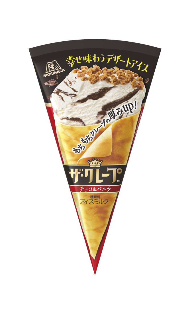 「ザ・クレープ<チョコ&バニラ>」は、バニラアイスやザクザク食感のチョコを、冷凍でもしっとり・もちもち食感のクレープシートで包んだクレープアイスです。
