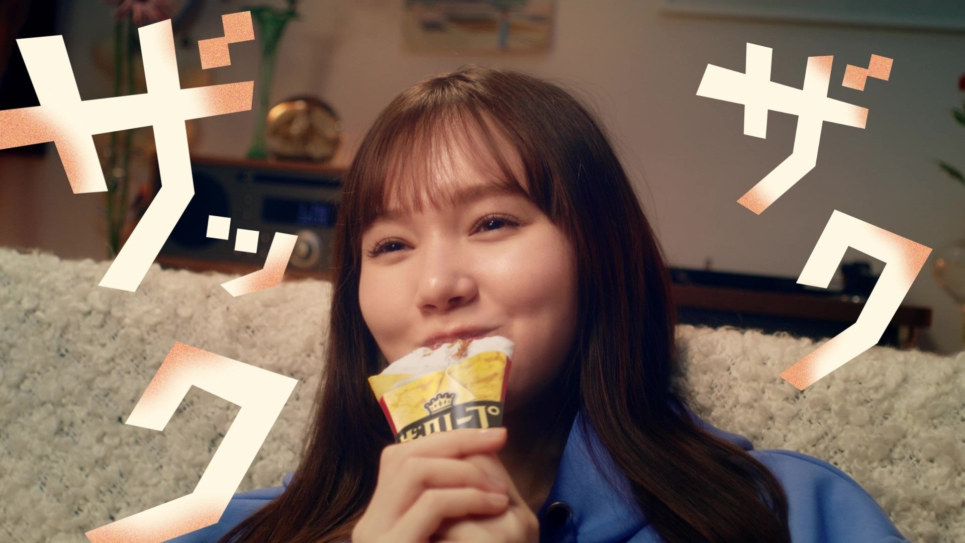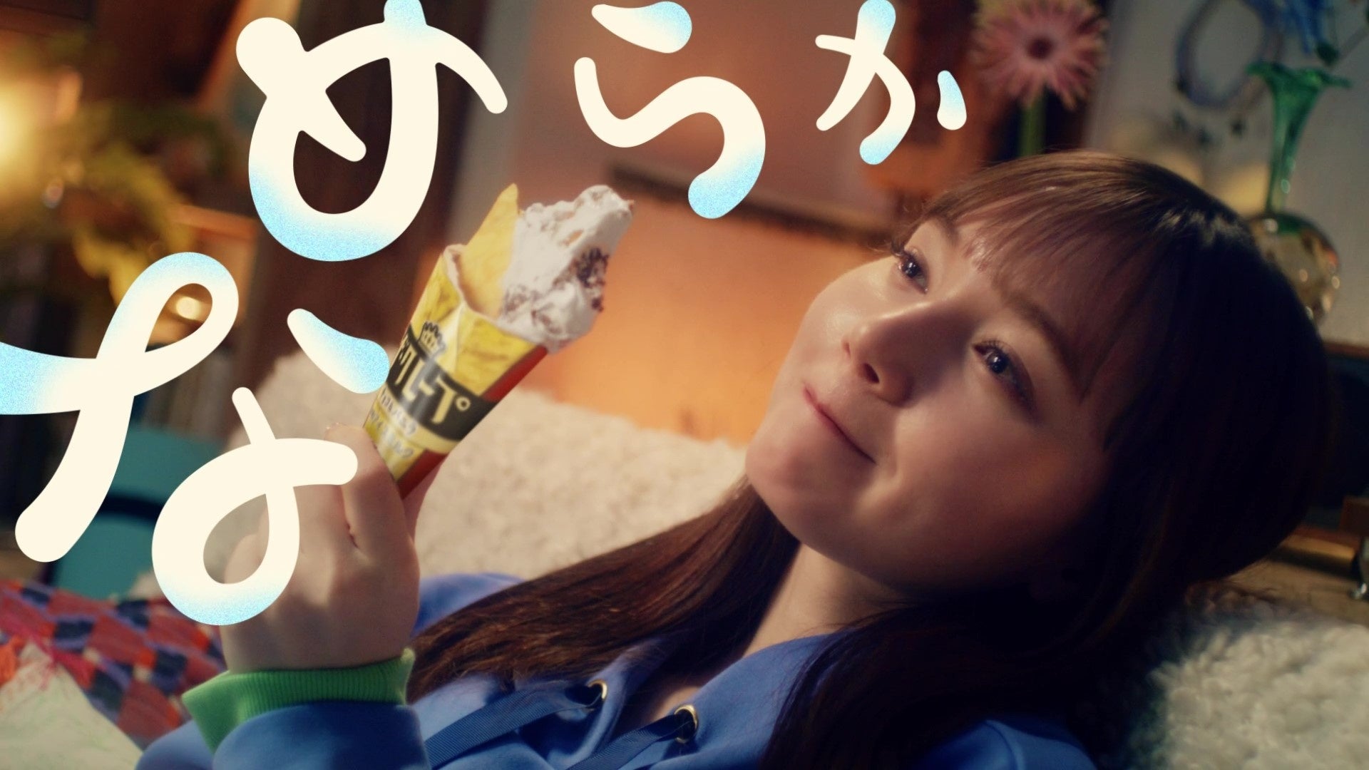 1日頑張ったごほうびアイスとして、ソファでくつろぎながら「ザ・クレープ」を食べるマーシュ彩さん。なめらかなバニラアイス、その中のザクザク食感のチョコ、もっちもちのクレープ生地…食べ進めるごとに変化する食感に癒されていきます。最後に、先端のとろ~りホイップクリーム部分を頬張って満足げな表情。お仕事終わり、家事終わりのごほうびとして幸せを味わえる、「ザ・クレープ」のおいしい魅力が伝わる動画です。マーシュ彩さんの、幸せそうに微笑むキュートな表情にご注目ください。