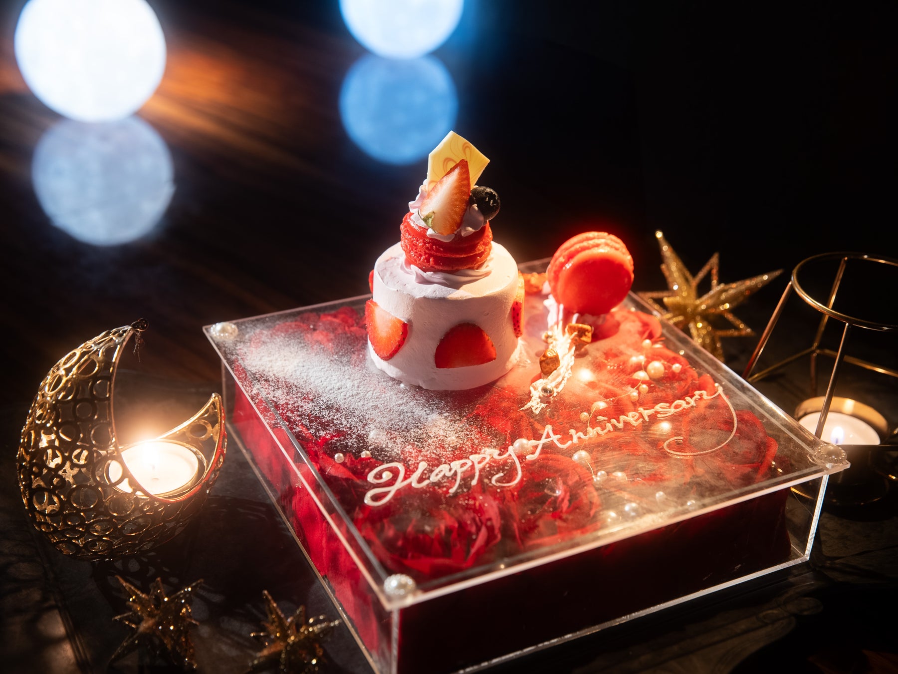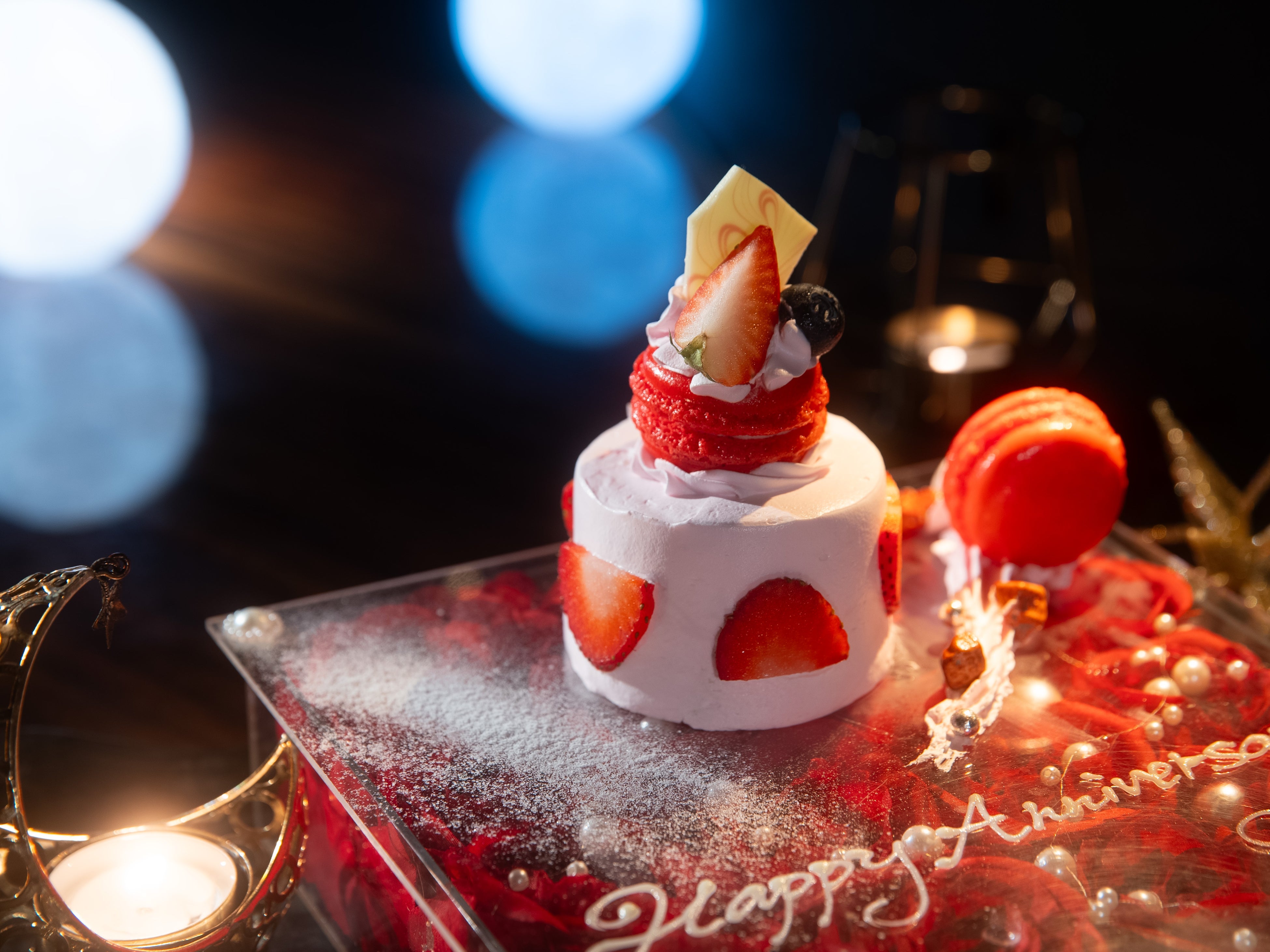 7日間限定の七夕特別コースでは織姫様と彦星様を見立てたオリジナルの乾杯カクテルと、七夕限定の特別ケーキは天の川で寄り添う二人をイメージした2色のマカロンとハートのケーキで表現。