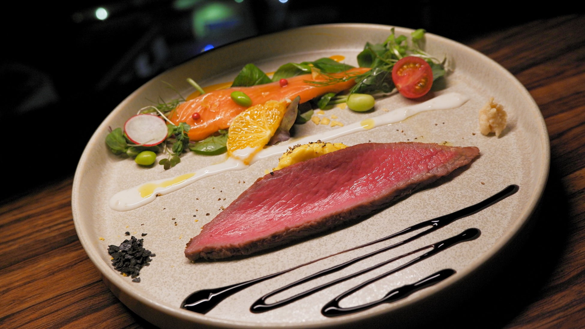 ・山形県産黒毛和牛刺し ルッコラサラダと有馬山椒のアクセント