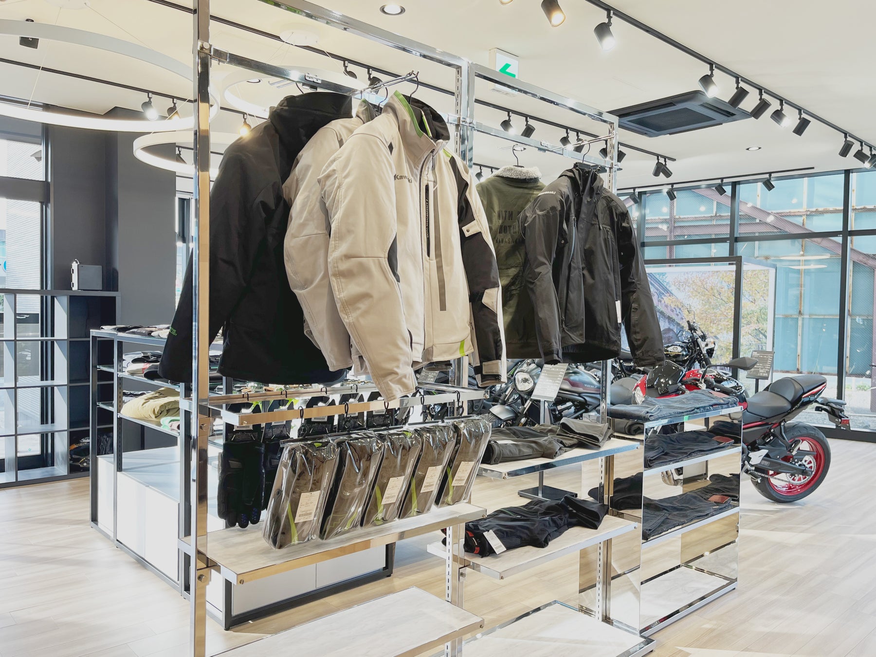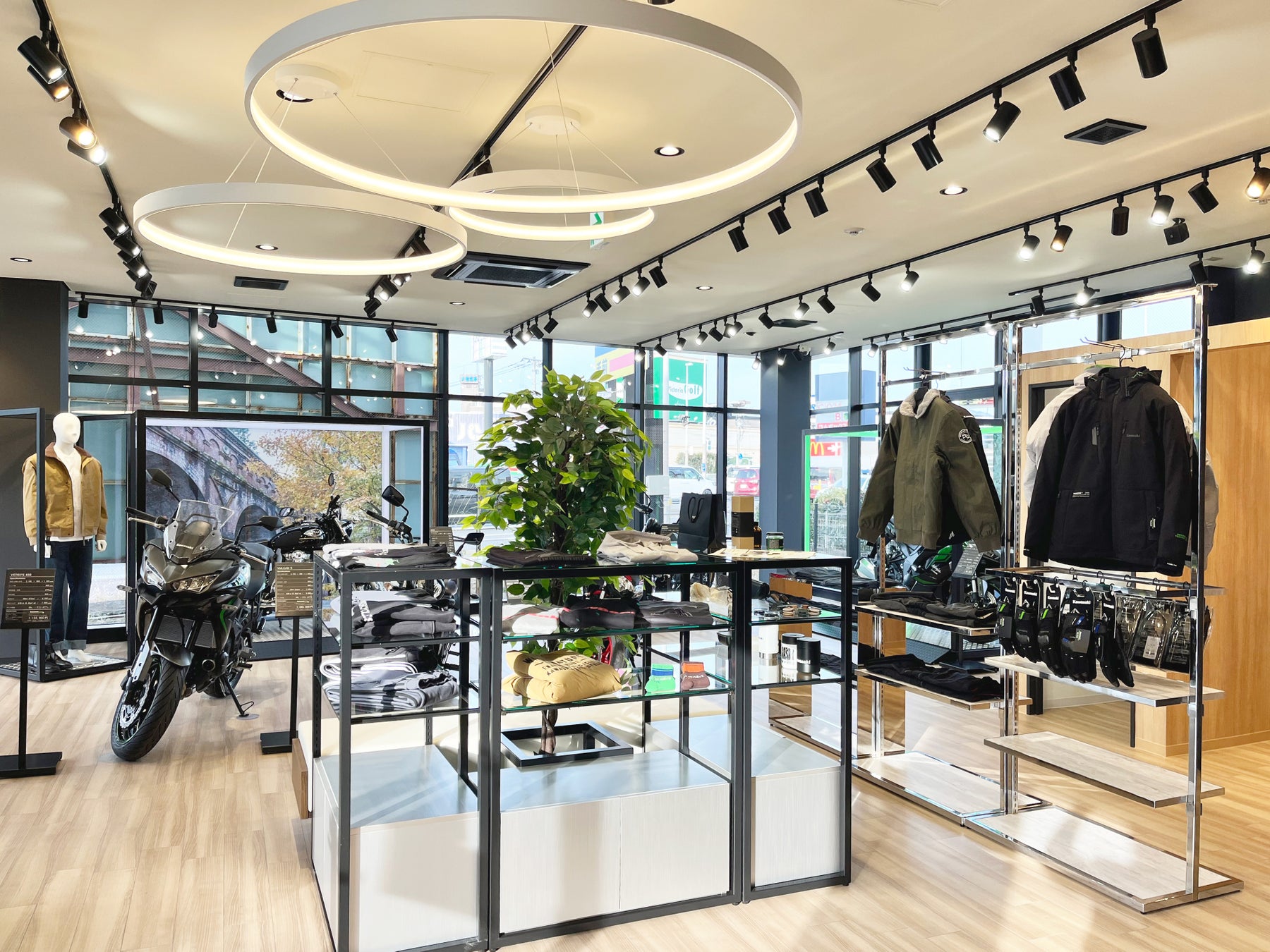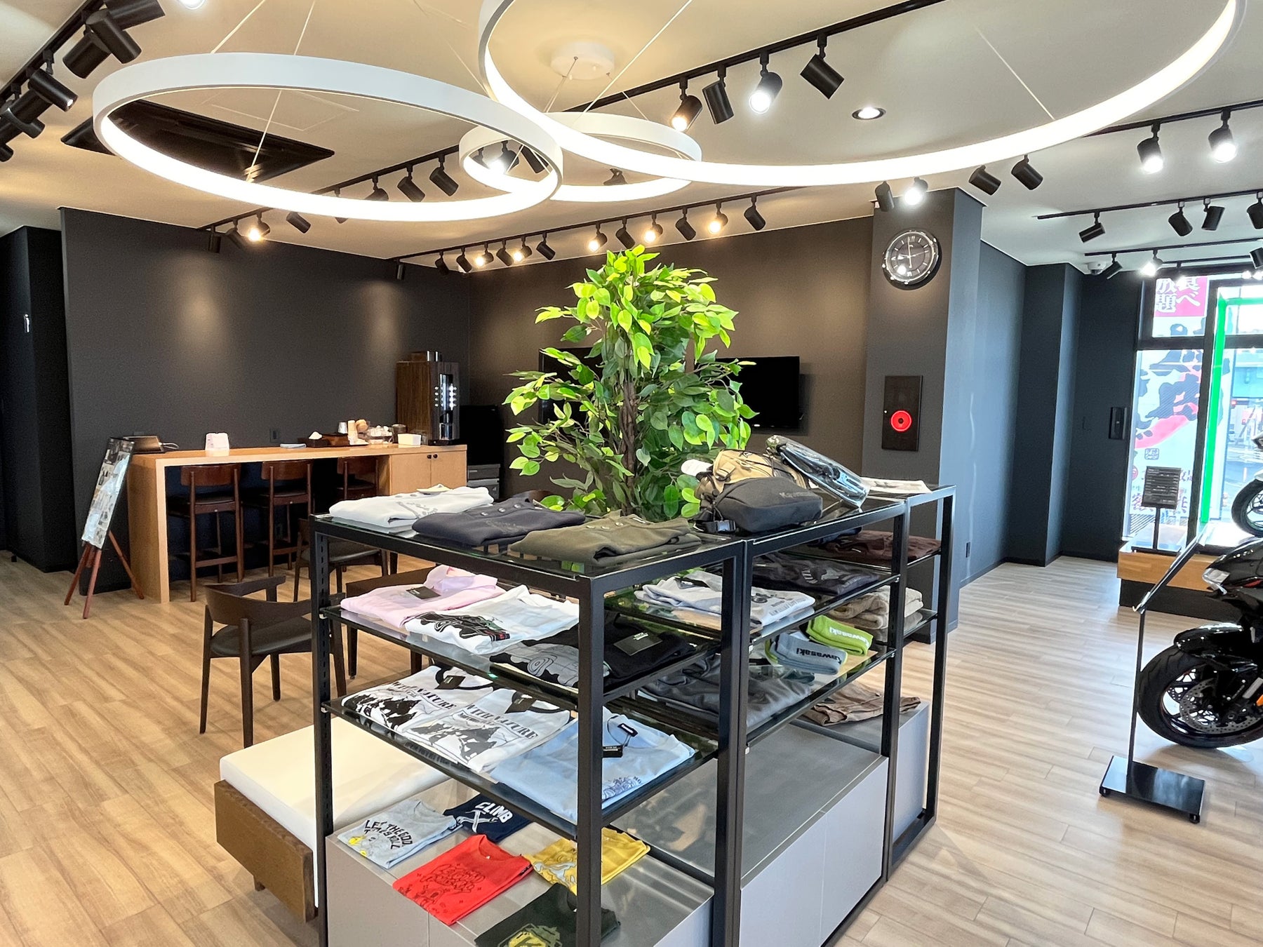 木目調のフロアと白い天井が織りなす明るい店内。モーターサイクルとプラザアパレルがゆったりと展示され、どなたでも楽しめる空間としています。