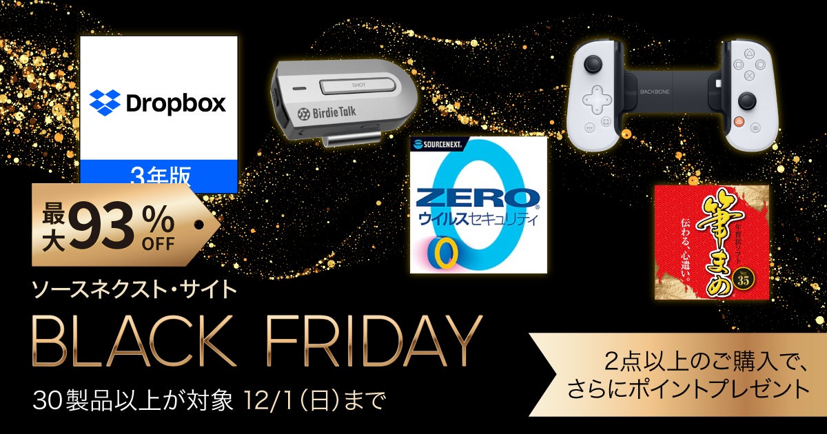 本セールでは、年賀状ソフト「筆まめ」、セキュリティソフト「ZERO スーパーセキュリティ」、ストレージサービス「Dropbox Plus 3年版」などのソフトウェアのほか、対話型ゴルフAIデバイス「BirdieTalk」や、スマホ用ゲームコントローラー「Backbone One」の最新版を含む、全30製品以上を最大93%割引の限定プライスで提供します。さらに、ブラックフライデー対象製品を2点以上ご購入いただいた方に、購入金額の10%分のポイントを後日プレゼントします。