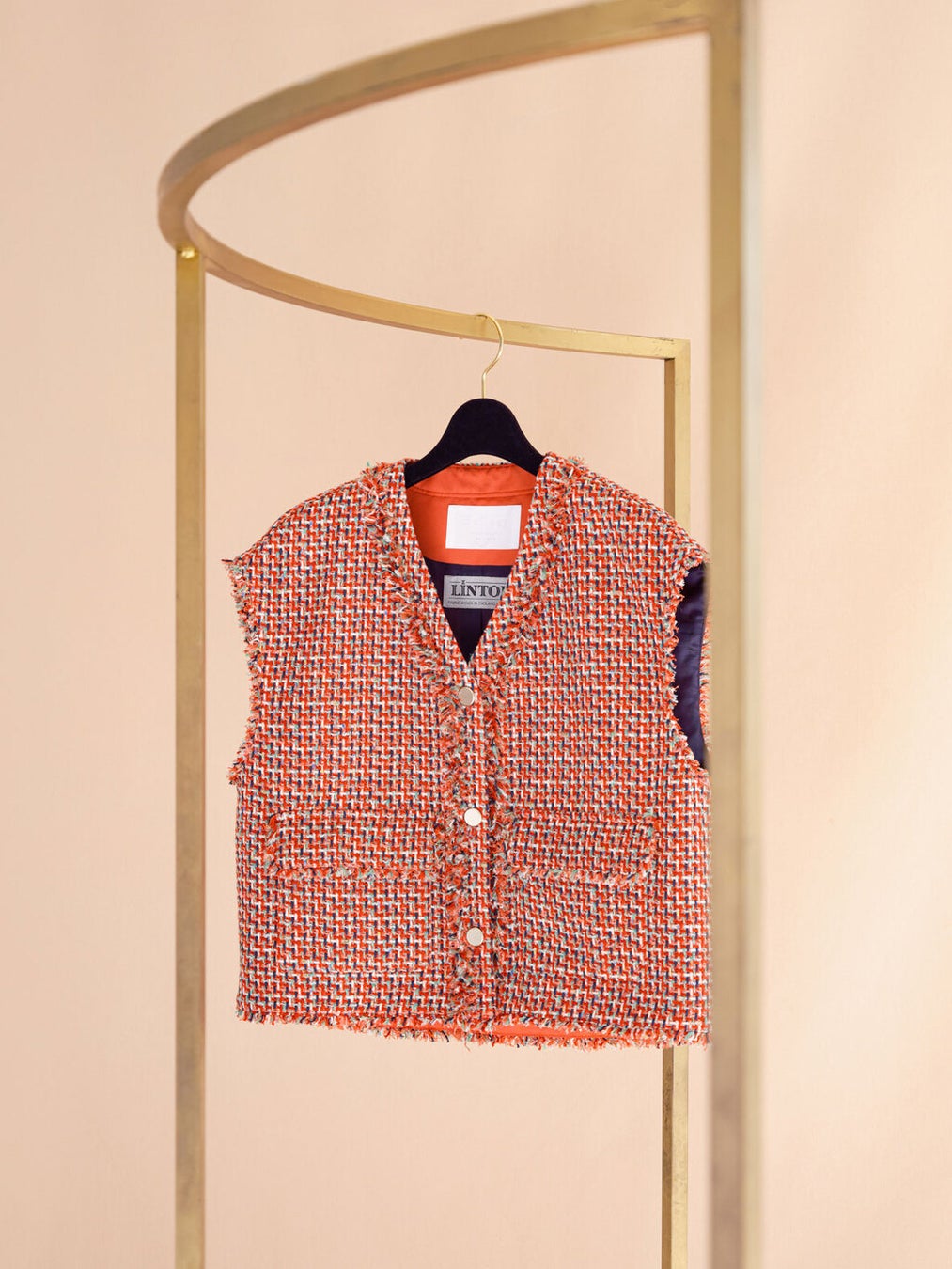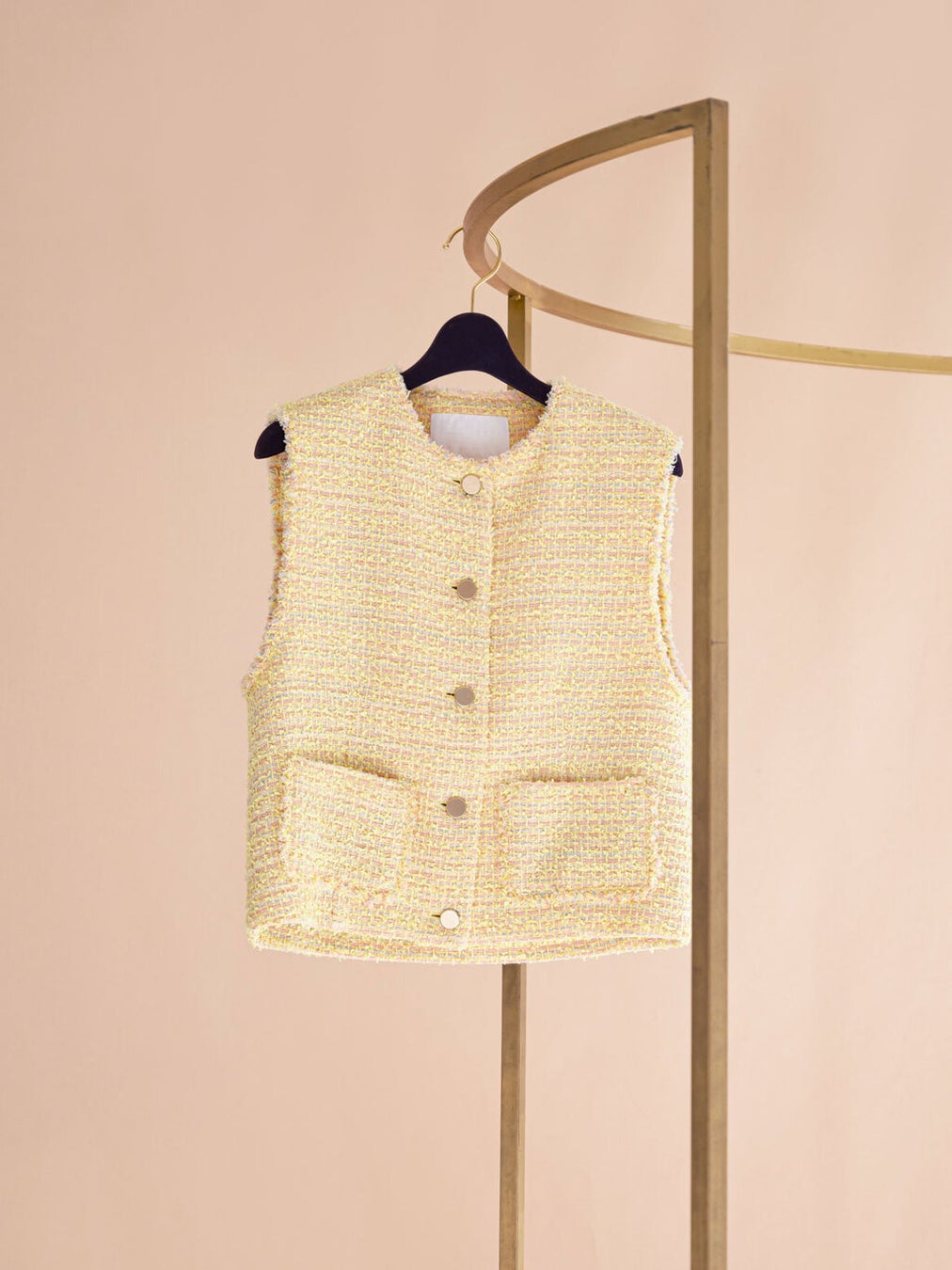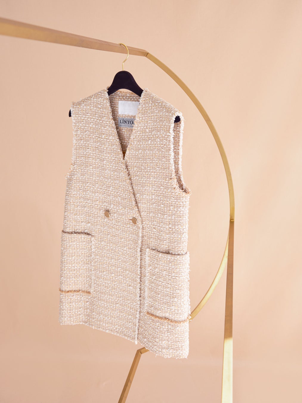 ジレは、このユニークな生地の魅力を最大限に生かしミニマルなシルエットに仕上げました。