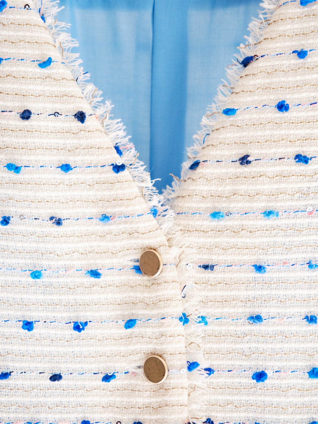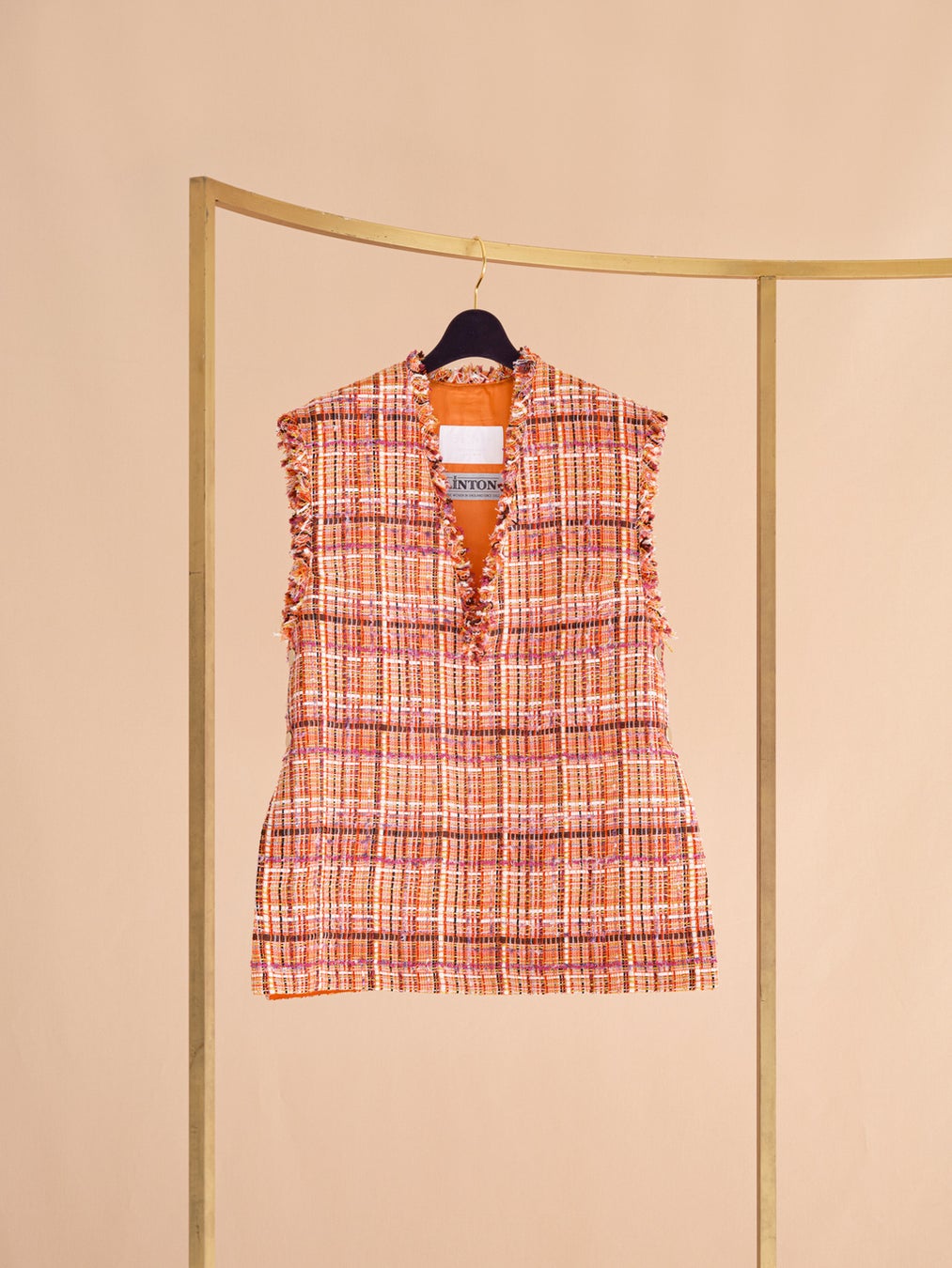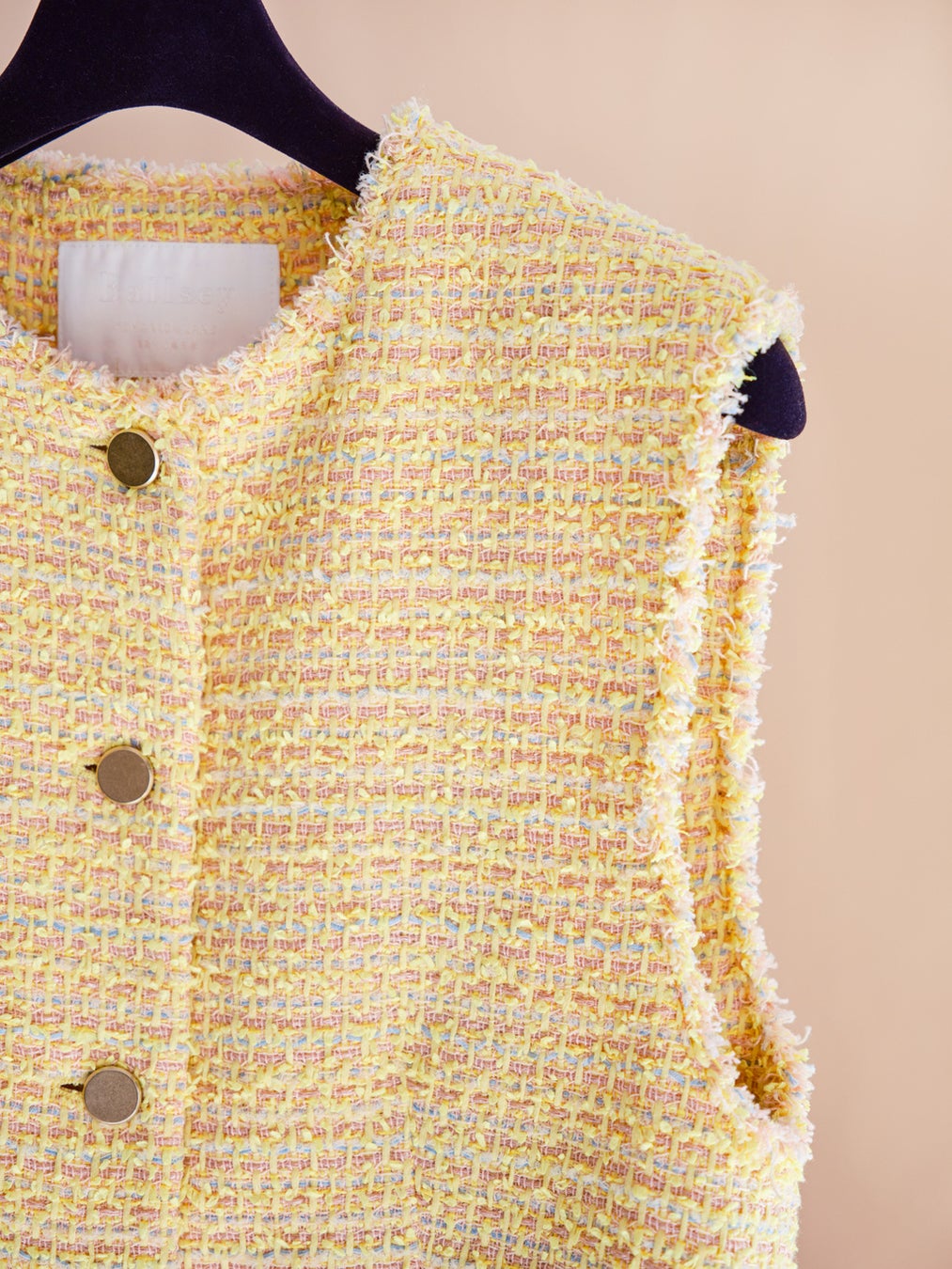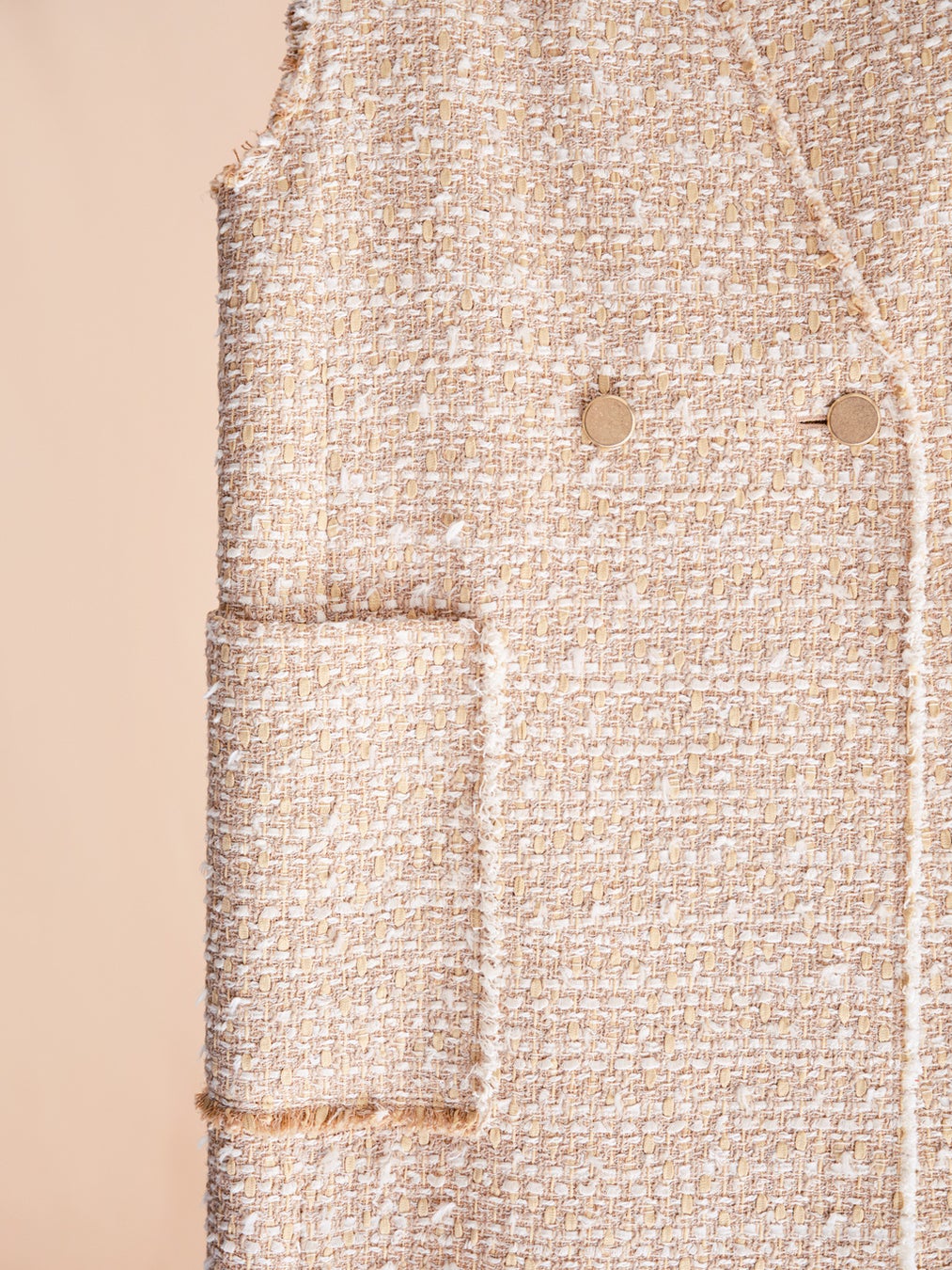 ジレは、このユニークな生地の魅力を最大限に生かしミニマルなシルエットに仕上げました。