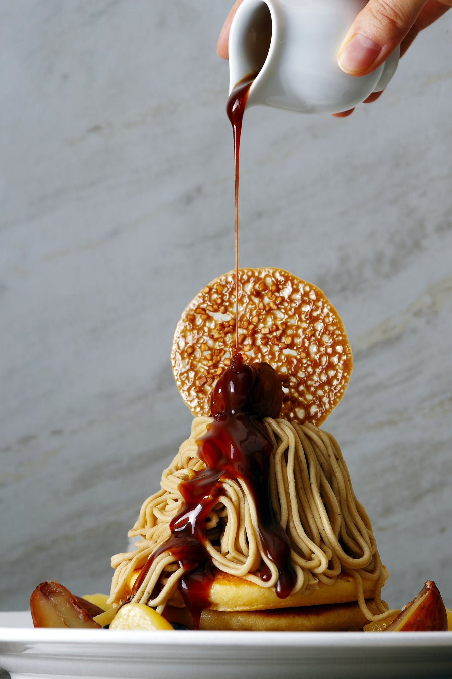 パンケーキは、アーモンドの風味をきかせたほんのり甘い味わいのしっとりとした生地にバニラアイスをのせ、和栗とフランス栗を合わせた濃厚なモンブランクリームを大胆にしぼりました。トップには栗をひとつのせ、サクサクのアーモンドチュイルで満月の月夜をイメージした秋を堪能する一品に。パンケーキの周りはホクホクとした味わいの栗と洋梨のコンポート、さらにアーモンドやピスタチオなど香ばしいナッツを配し、秋の味覚をたくさん詰めました。モンブランやナッツと相性抜群の、甘塩っぱさがくせになる塩キャラメルソースをかけてお楽しみください。