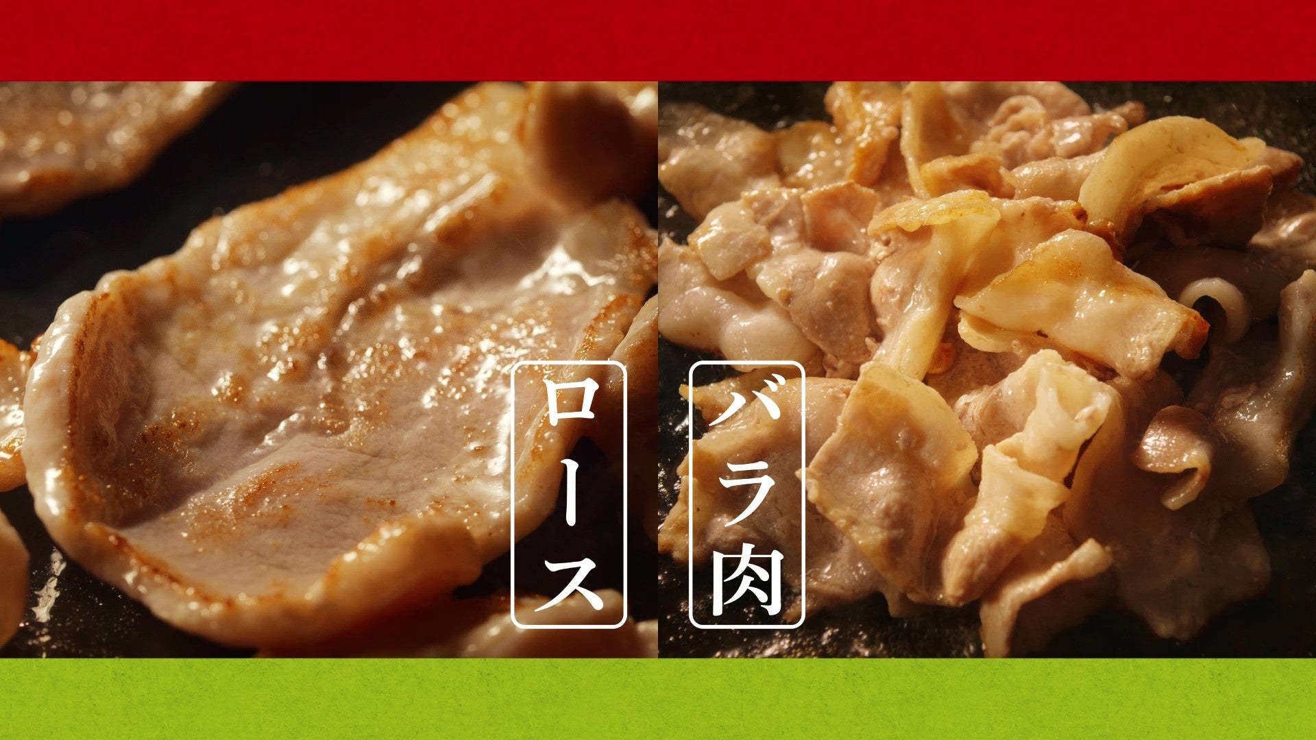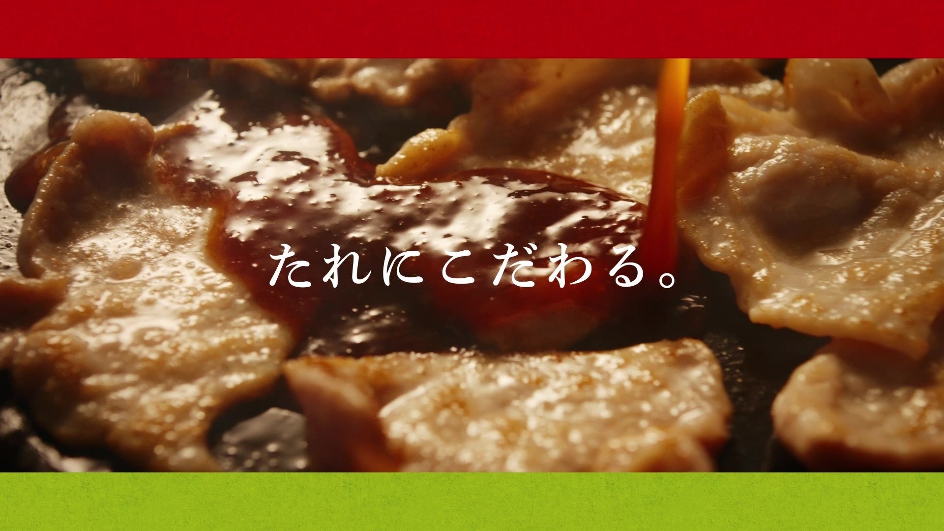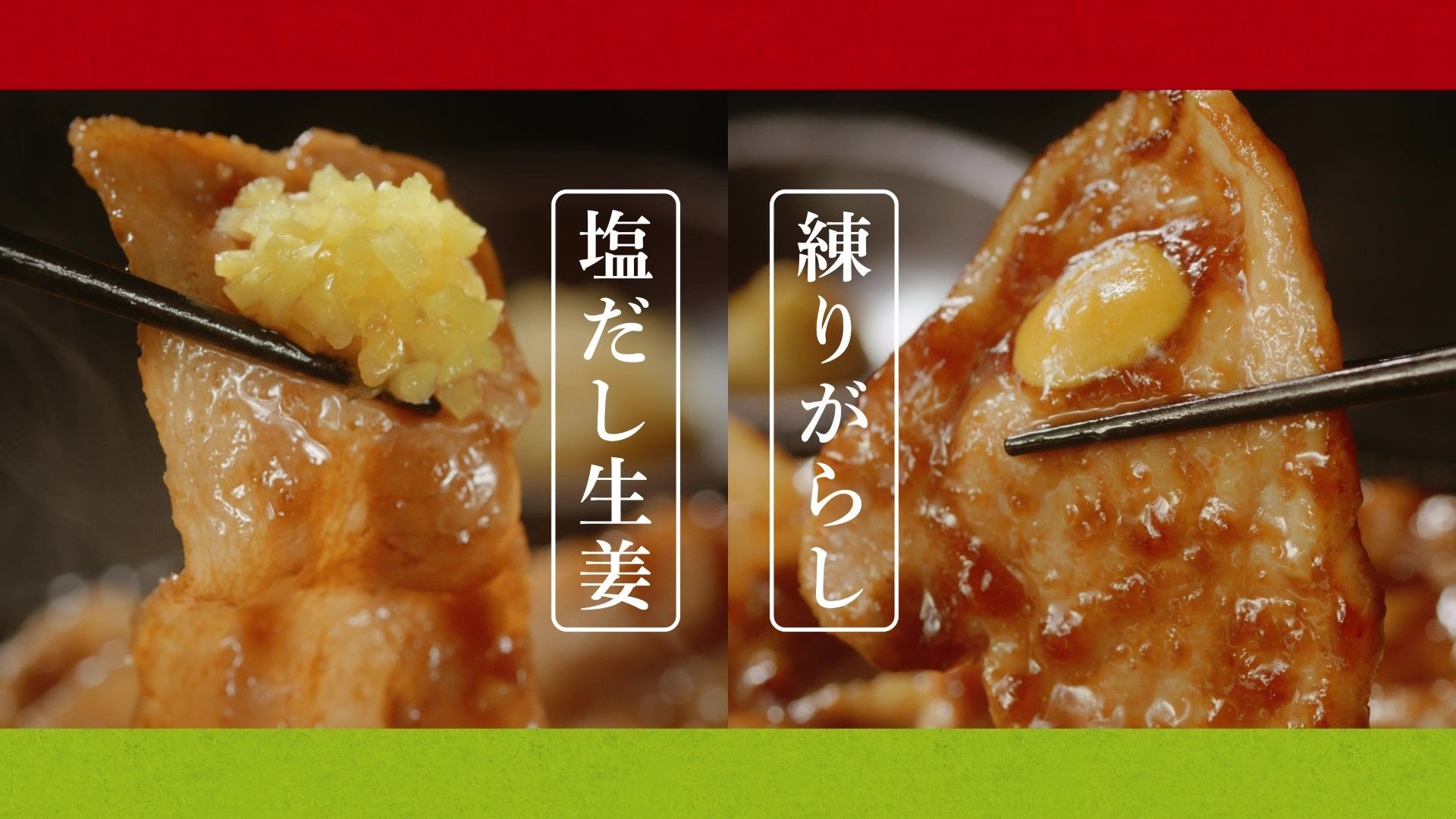 三元豚のロースとバラ肉、国産黄金しょうがを100%使用したこだわりのたれ、味変を愉しめる塩だし生姜・練りがらしなどをテンポよく切り替わる映像と印象的な音楽で訴求しています。