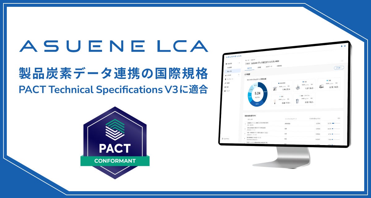アスエネ株式会社(本社:東京都港区、Founder 代表取締役CEO:西和田 浩平、以下「当社」)が提供するLCA/CFP算定サービス「ASUENE LCA」は、製品炭素データ連携の国際規格「PACT Technical Specifications V3」に適合しました。