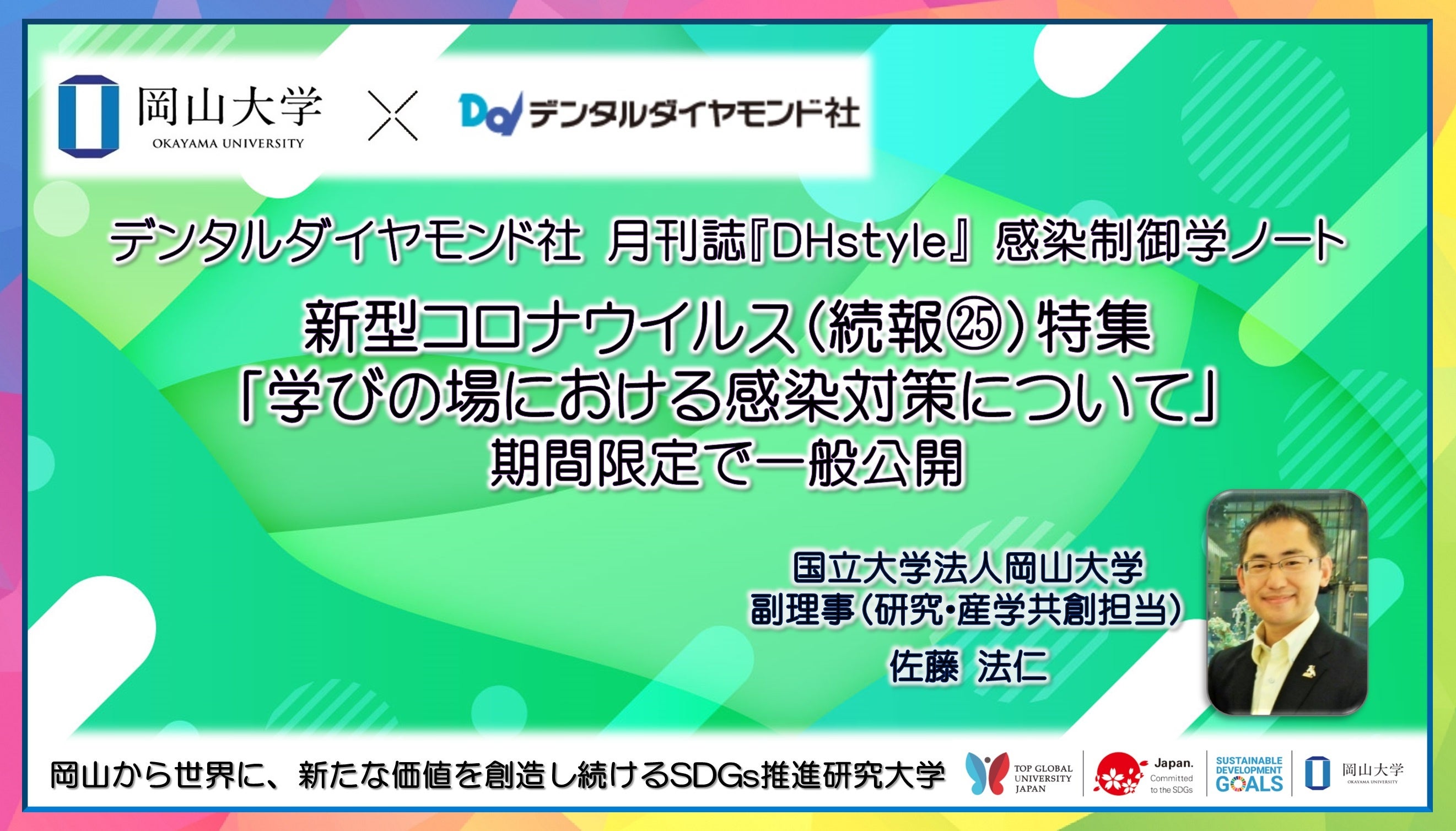 国立大学法人岡山大学(本部:岡山市北区、学長:槇野博史)東京オフィス駐在の佐藤法仁副理事(研究・産学共創担当)・URAは、歯科総合出版社である株式会社デンタルダイヤモンド社(本社:東京都文京区本郷、代表取締役:濵野優)が歯科衛生士向けに発行している月刊誌『DHstyle』に、連載「感染制御学ノート」を2012(平成24)年1月から行っています。