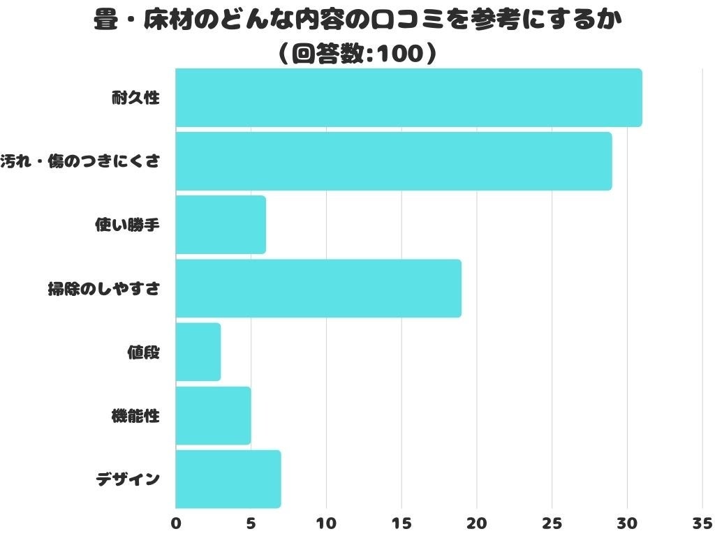 畳・床材のどんな内容の口コミを参考にするかをアンケートにて調査したところ、1位は「耐久性」でした。