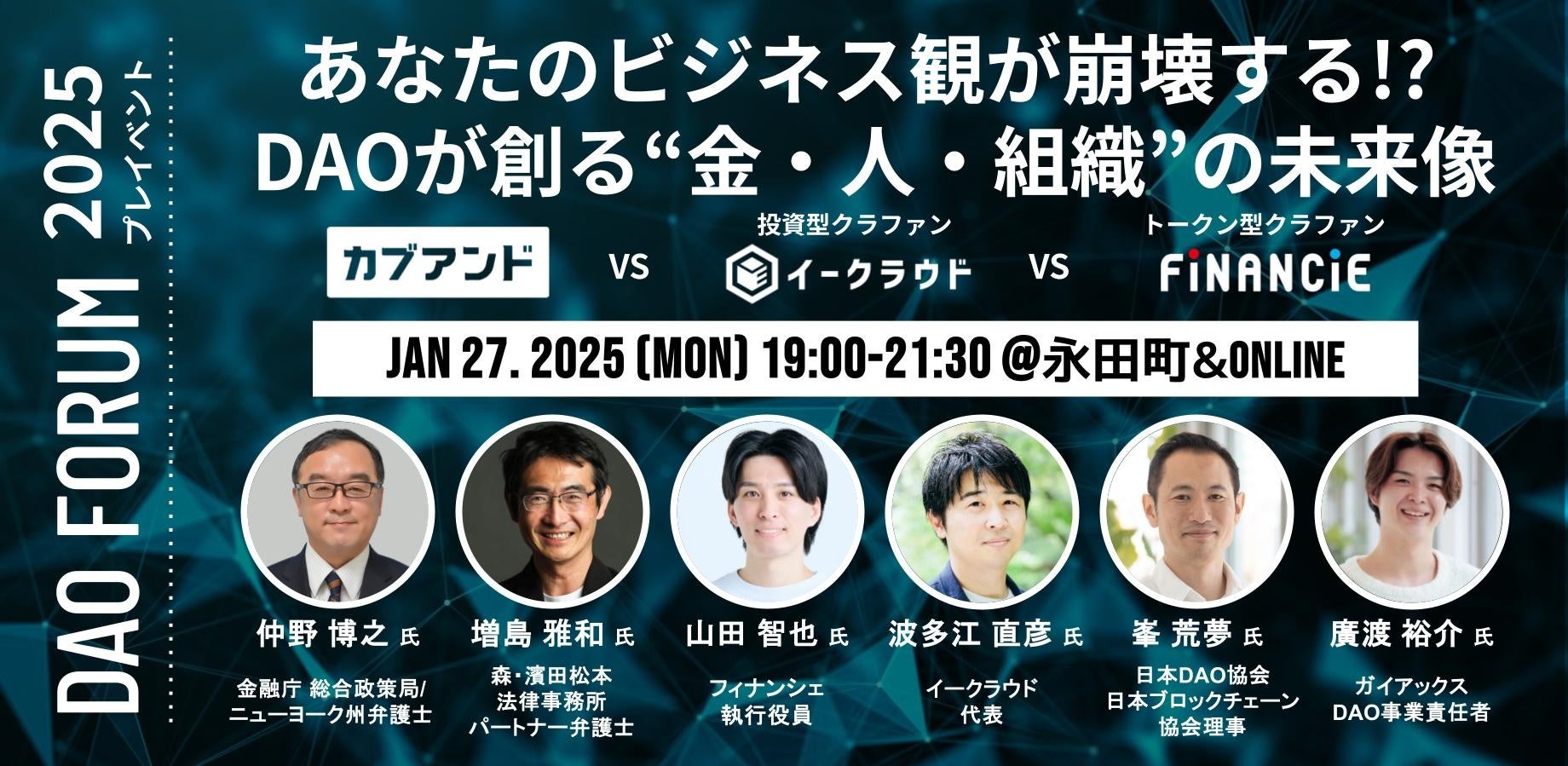 自律分散型組織「DAO」のコンサルティング・実務支援を提供する株式会社ガイアックス(本社:東京都千代田区、代表執行役社長:上田 祐司、証券コード:3775、以下 ガイアックス)は、2025年1月27日(月)に東京・永田町にて、日本のDAO(自律分散型組織)の全てが集結する『DAO FORUM 2025』( https://daox.solutions/dao-forum )のプレイベントとして、「DAOの社会実装を事例で深堀り~カブアンド、投資型クラファン、トークン型クラファン~」を開催します。
