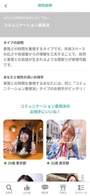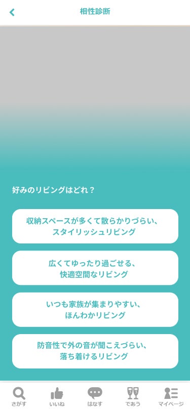 自分の理想の間取りから相性の良いパートナーを見つけるための診断ツールです。理想の家のスタイルや広さなど、いくつかの住まいに関する質問に答えるだけで、理想の間取りタイプをもとにした相性の良いパートナーを推薦してくれます。
