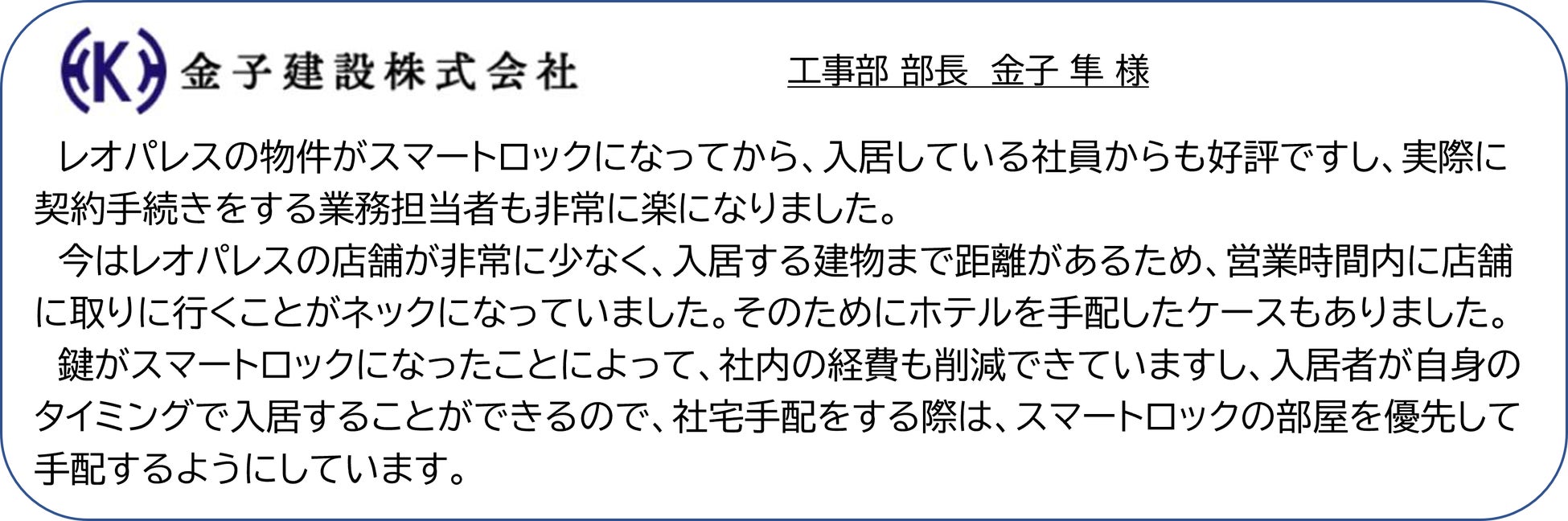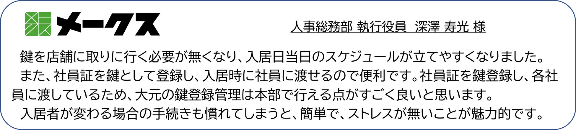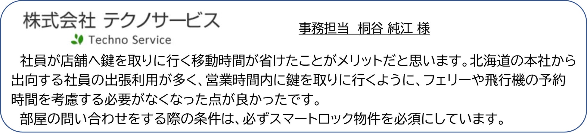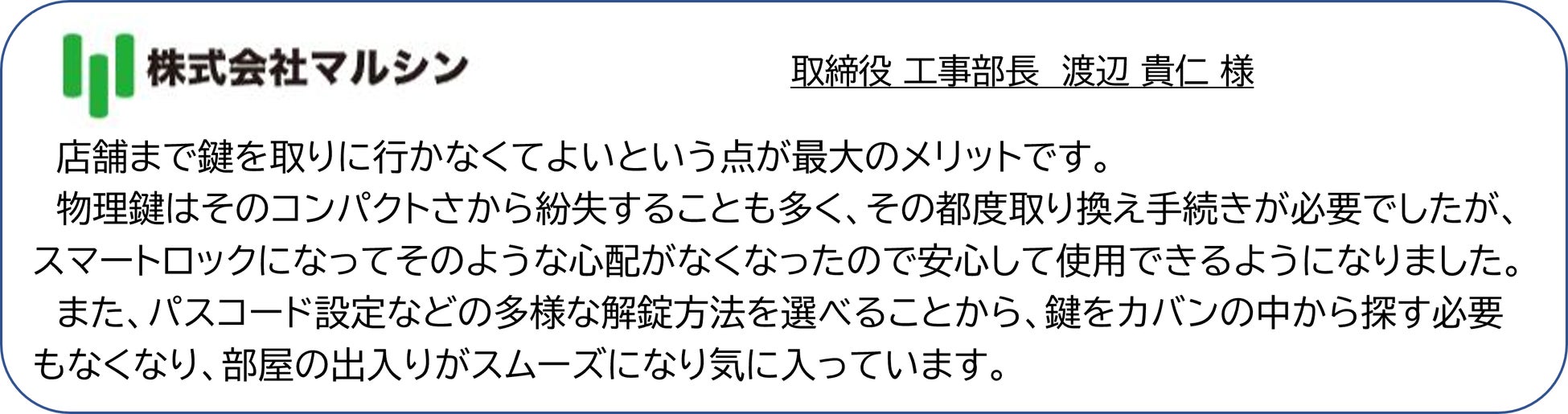 スマートロックの設置により、鍵に関する業務の削減による当社の生産性向上に加え、鍵受け取りのための来店が不要になるなど、お客様の利便性向上を実現いたしました。