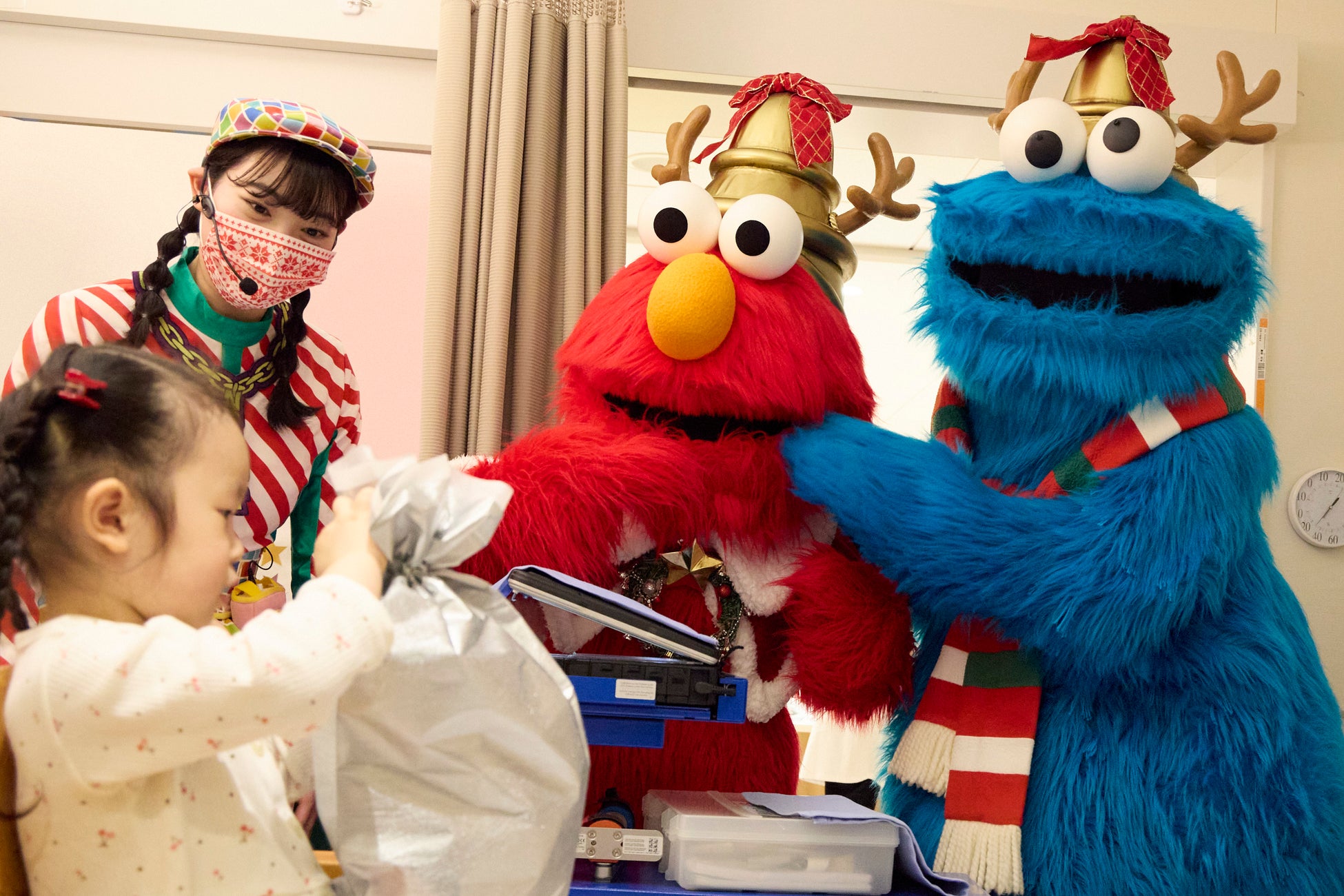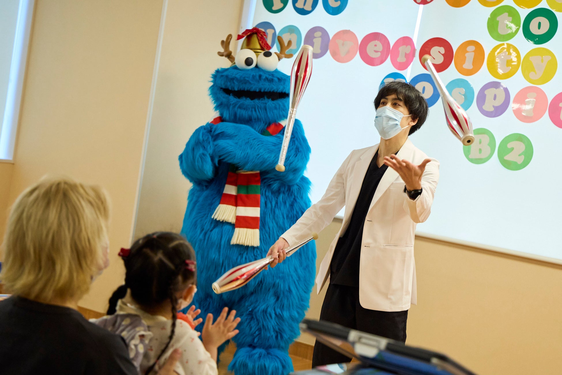 訪問当日、何も知らされていない子どもたちを前に、セサミストリートのエルモとクッキーモンスターがサプライズ登場!早速クリスマス・プレゼントが手渡されると、子どもたちからはとびきりの笑顔があふれたほか、東大病院で小児医療に携わる水野雄太先生も、この日のために練習を積んだ“ジャグリング”を披露。「わくわくした!」「先生のジャグリングすごかった~」など、普段とは違う水野先生の姿に、集まった子どもたちから歓声があがりました。またローソンからは、一部の店舗で導入している“クレーンゲーム”機をこの日限定で会場へ特別設置するクリスマス・プレゼントが! この日初めて“クレーンゲーム”にチャレンジする子どもたちが多く、ドキドキしながら、ご家族とともに大いに楽しんでいただくなど、心温まるにぎやかな一日となりました。