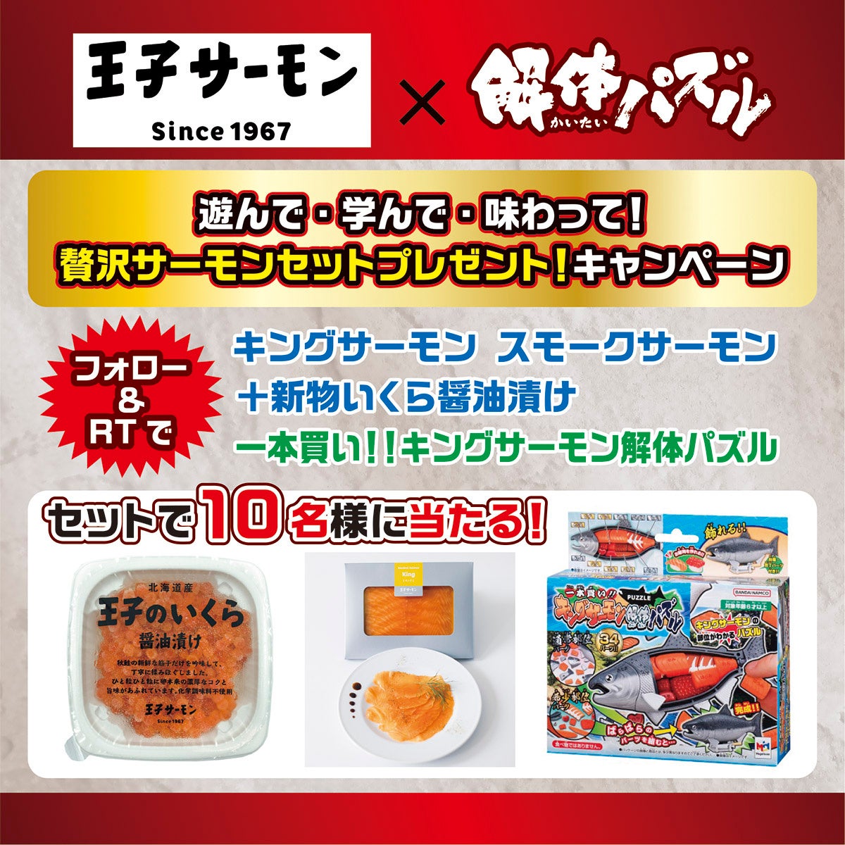 応募方法は、期間中に王子サーモン【公式】ツイッター(@Oji_Salmon)とメガハウスのメガトイ公式ツイッター(@MegaHouse_toy) をフォローし、対象のツイートをリツイートしていただいた方の中から抽選で「キングサーモン スモークサーモンと新物いくら醤油漬け」と「一本買い!!キングサーモン解体パズル」をセットで合計10名様にプレゼント致します。