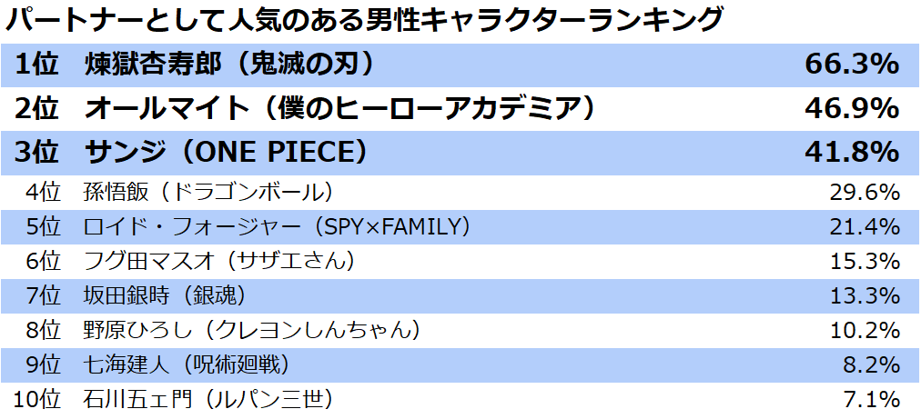 ■第1位は煉獄杏寿郎(鬼滅の刃)、第2位はオールマイト(僕のヒーローアカデミア)、第3位はサンジ(ワンピース)