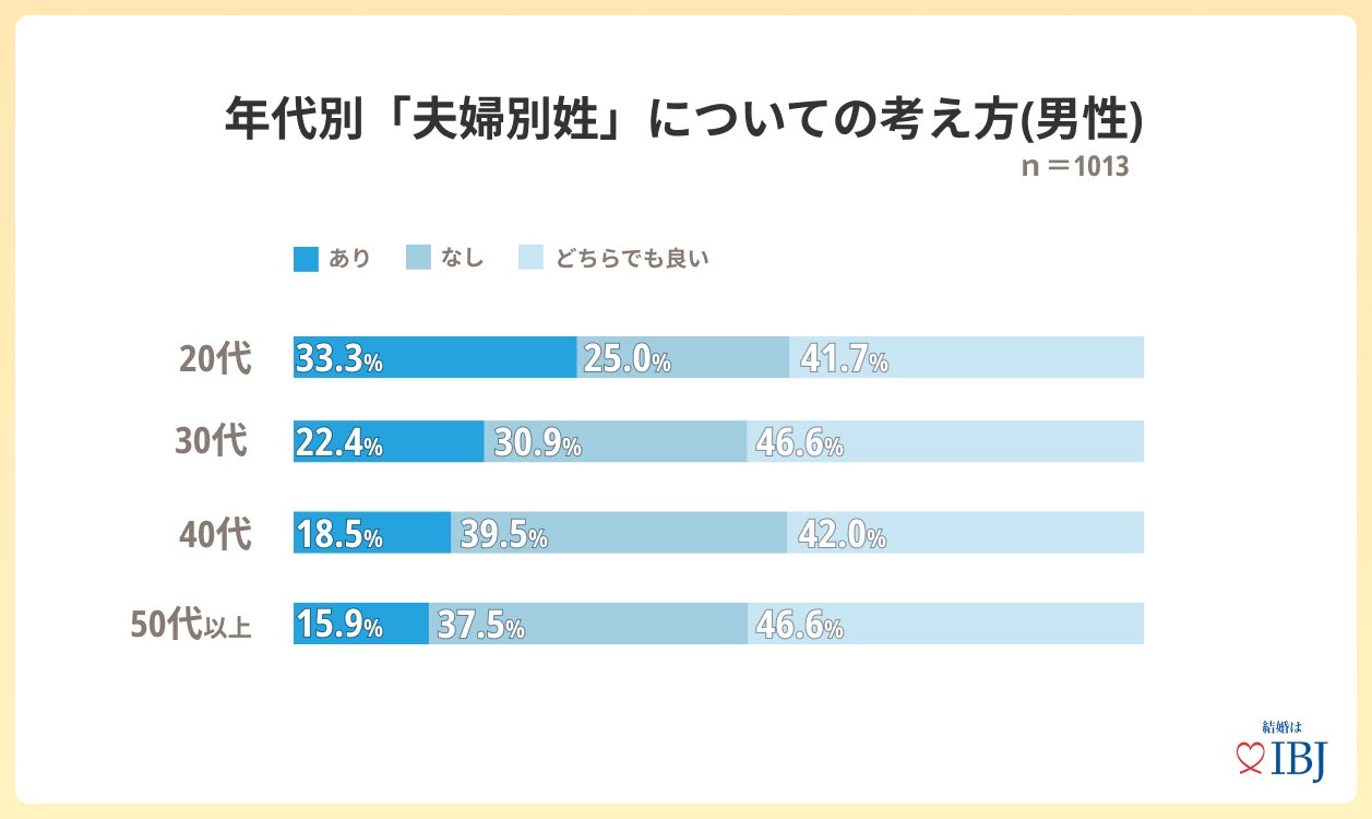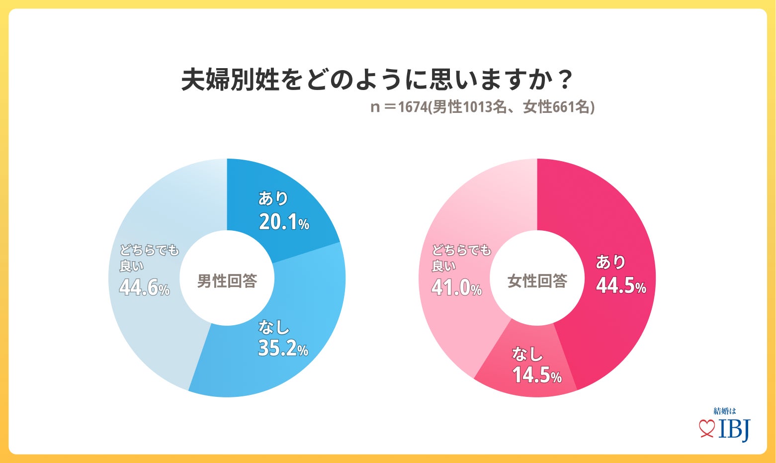 “夫婦別姓”4割以上の女性が「あり」と回答。特に20代女性は5割を超える結果に。【婚活男女1,682人に調査】
