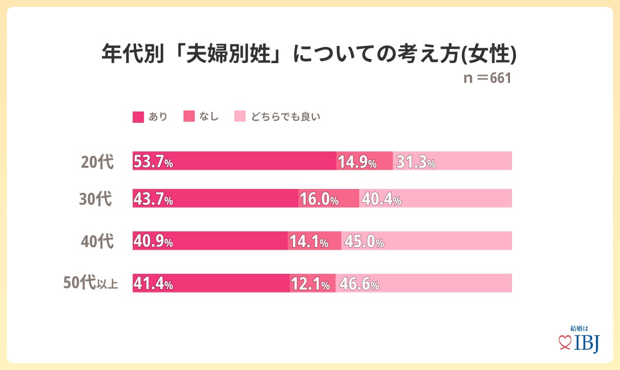 特に夫婦別姓について「あり」と回答する20代女性は53.7%と半数を超える結果に。「あり」と回答した女性の意見として「氏名変更の手続きが面倒だから」「仕事に影響があるから」などの声が多く、結婚後も仕事を続ける女性にとって“氏名変更”は負担に感じるのかもしれません。
