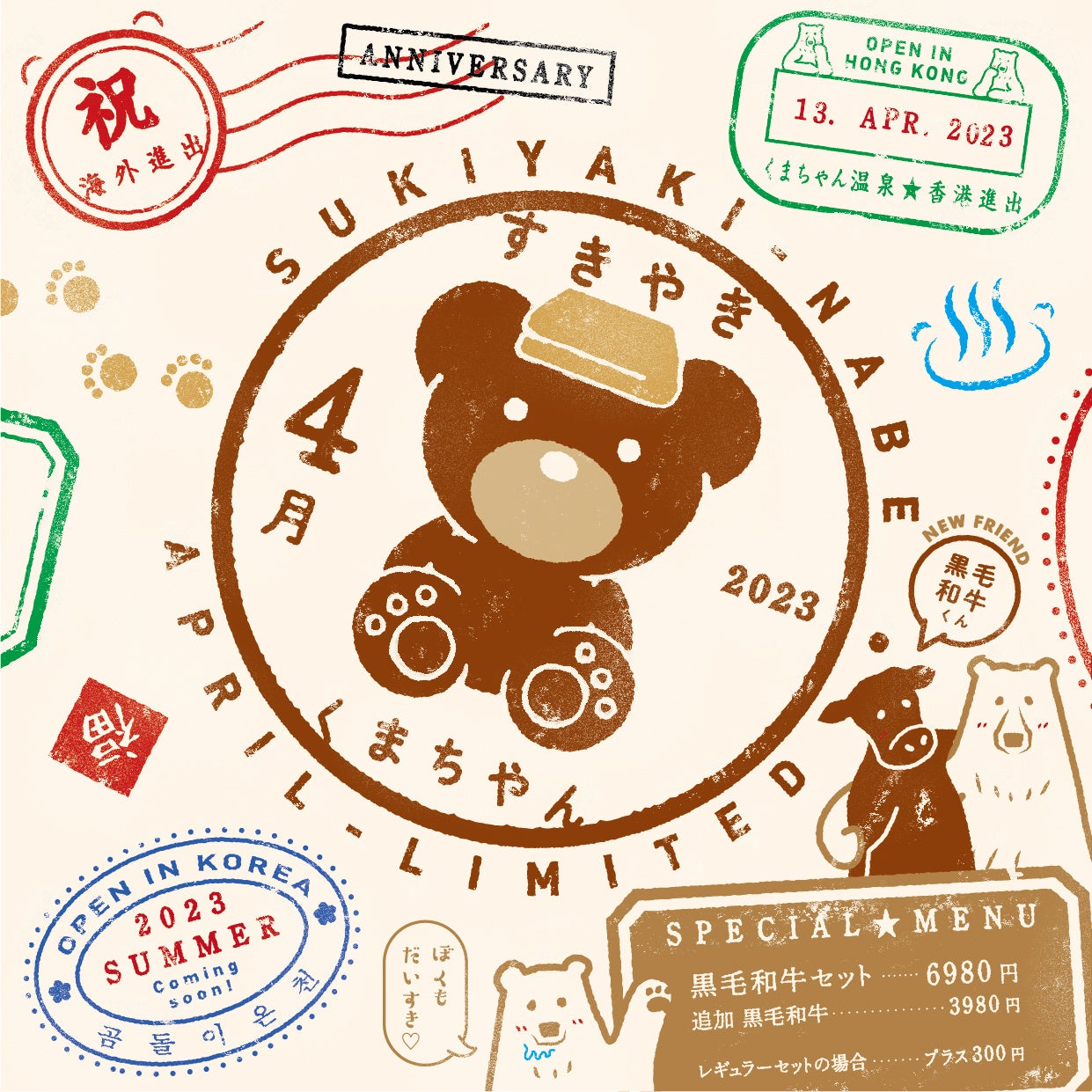 海外進出を目指して2020年に誕生した「北海道めんこい鍋 くまちゃん温泉」。コロナの影響により延期をしていた海外進出でしたが、現地パートナー企業とともに、2023年4月に香港、そして2023年夏に韓国へ出店することが決定いたしました。海外進出を記念して渋谷宮益坂店(東京・渋谷)にて期間限定で販売するのが、すき焼き味を楽しめる鍋「祝 海外進出!季節の湯 すき焼き」。世界を魅了するおもてなし料理と言われるすき焼きを、“くまちゃん鍋”でお楽しみいただけます。くまの形に固めた出汁“くまちゃん”は全体をすき焼きのような焦げ茶色の出汁で作りあげ、顔の一部を豆乳だしで白色に。今まで以上のこだわりで、職人技が光るツートンカラーの“くまちゃん”が完成しました。豆乳を隠し味に加えたすき焼き味は、マイルドな風味。すき焼き風を楽しんでいただきたく、半熟卵もお付けしています。