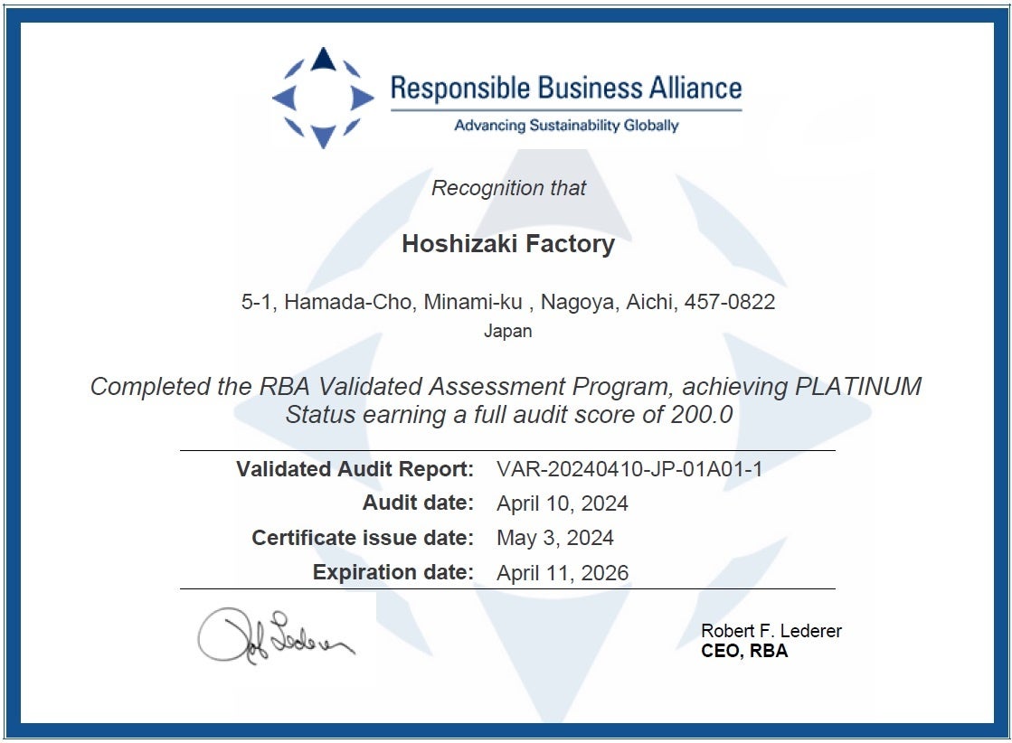 このたび、星崎工場はVAP監査を受審し、監査項目である労働、安全衛生、環境、倫理、サプライチェーン管理システムにおける適正な管理が認められ、最高得点である200点満点を獲得して、プラチナ認証を取得した。