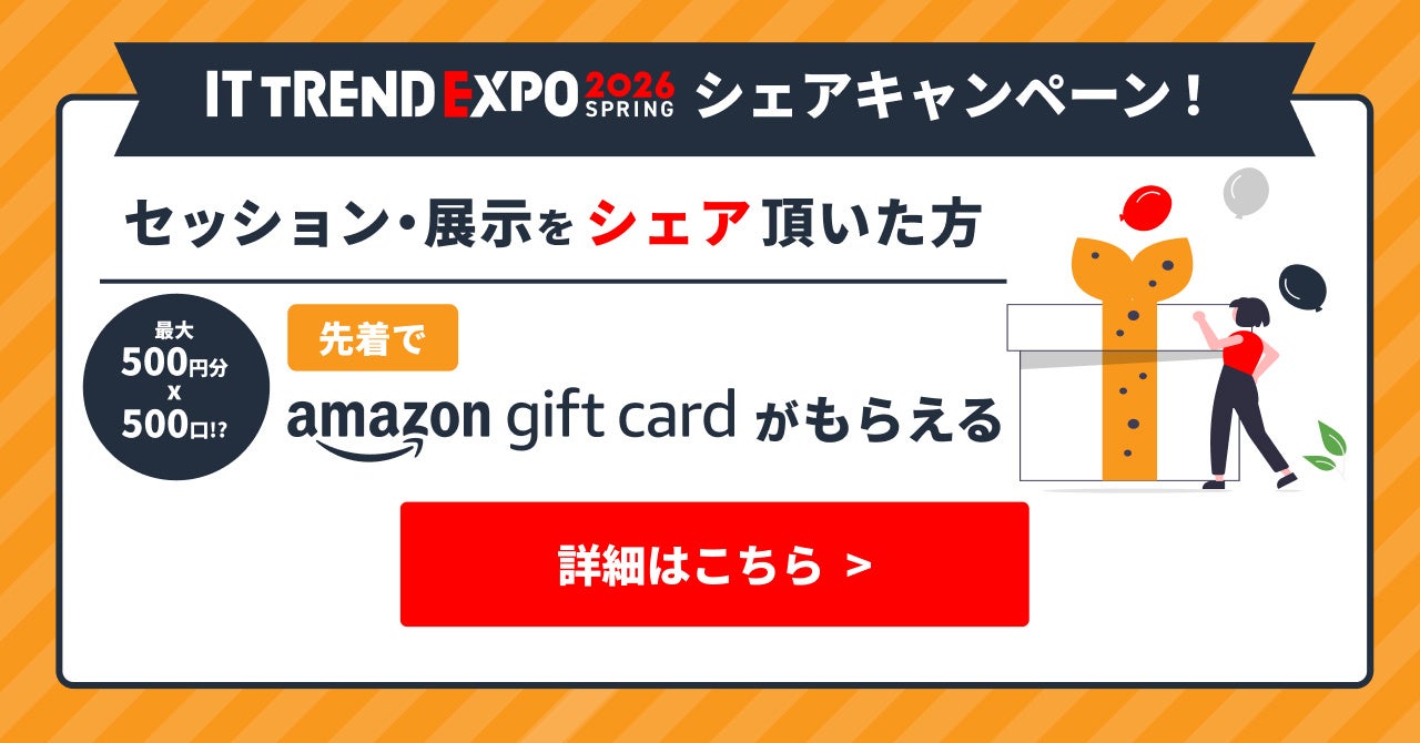 【最大25万円分】同僚・友人にシェアすると 先着で500円分のAmazonギフトカードが必ずもらえる!業界最大級のオンライン展示会「ITトレンドEXPO2026 Spring」参加申し込み受付中