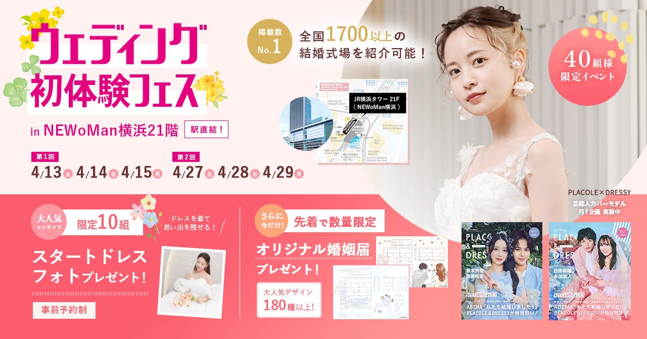 横浜駅直結、JR横浜タワーの21階、PLACOLE&DRESSY(プラコレ&ドレシー)の“体験型”花嫁相談カウンター【DRESSY ROOM】でセルフフォト「PICmii」無料体験など豪華特典付き!ウェディング初体験フェス in 横浜を開催いたします。安心のアクセス、商業施設NEWoMan横浜に直結ということもあり、お立ち寄りいただきやすい場所となっております。4/13(土)~4/15(月)の3日間限定で40組様無料ご招待での限定開催となっております。このフェスでは「あなたに合った内容」で様々なコンテンツを用意し、結婚式準備をサポートいたします。