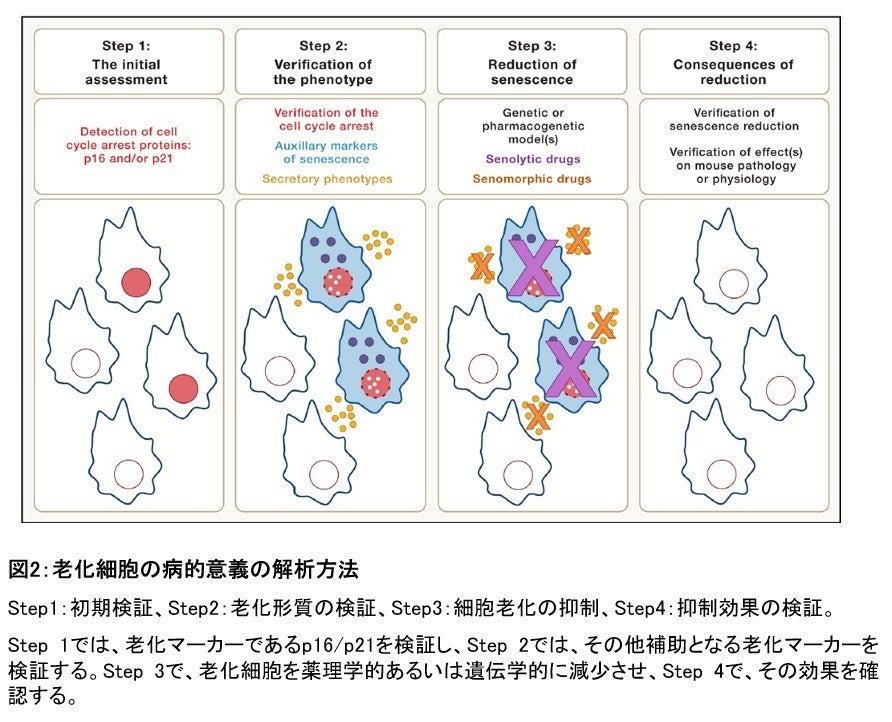 また、老化細胞を生体内で検証できるリポーターマウスモデルや、老化細胞の数や活性を制御できる遺伝子改変マウスの有用性やピットフォールについても述べています。また今後の新しい展開として、マウス以外の生物における細胞老化研究やオミックス解析、人工知能を用いた解析などの研究についても述べています。最後に、生体における老化細胞の病的意義を検証するための4つのステップ、すなわち、1. 初期評価 2. 老化表現系の検証 3. 老化軽減モデルの作製 4. 老化軽減効果の検証 について述べています(図2)。