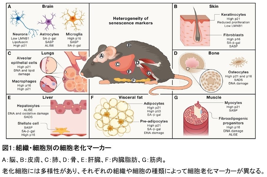 本ガイドラインでは、適正な細胞老化マーカーについて包括的に提案し、その評価方法や有用性について、さまざまな組織での多様性を含めて言及しています(図1)。