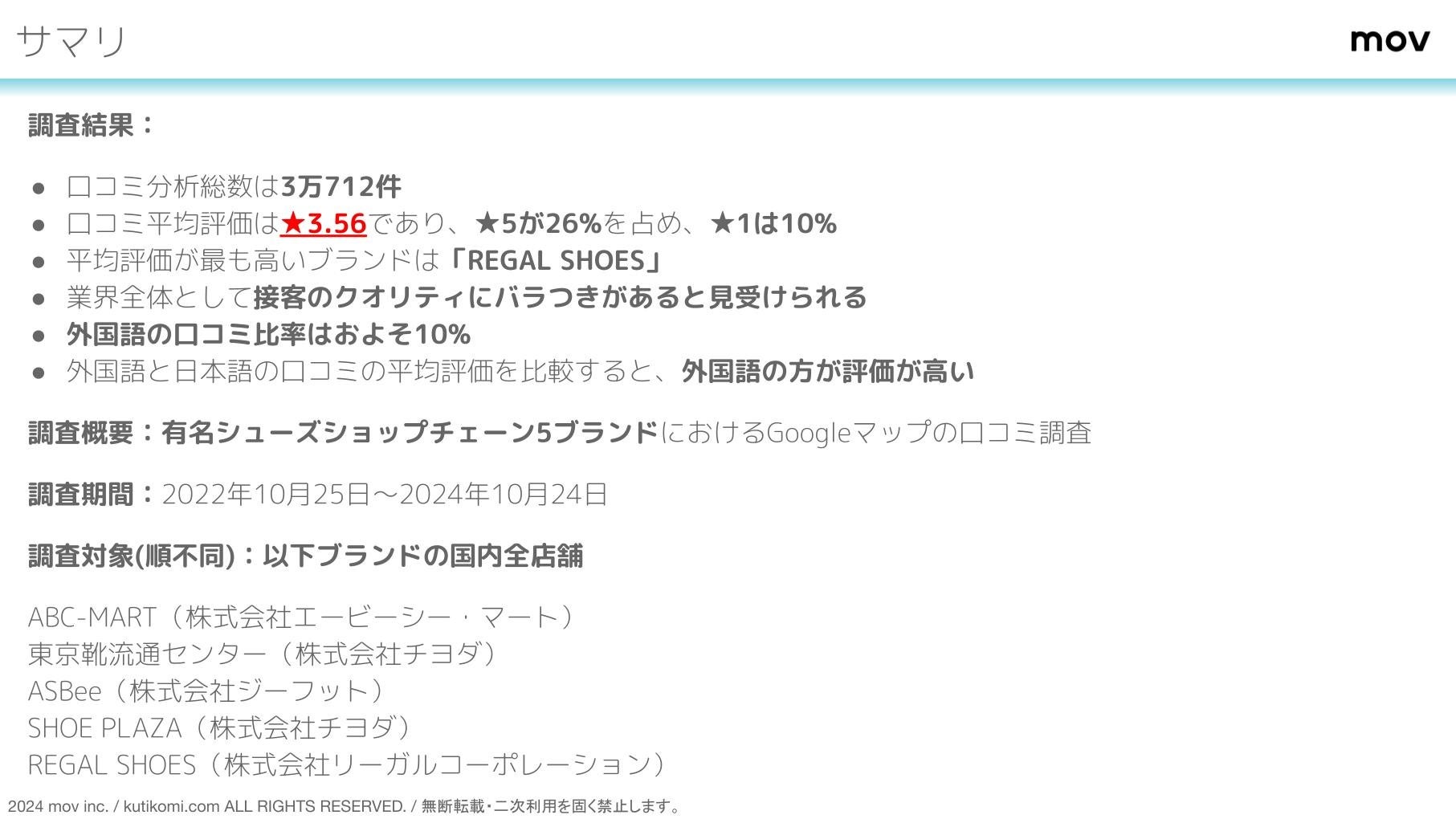 調査内容の詳細をご覧になりたい場合は、レポートをダウンロードしてご覧ください。また、自社の分析を希望される方は株式会社movまでお問い合わせください。