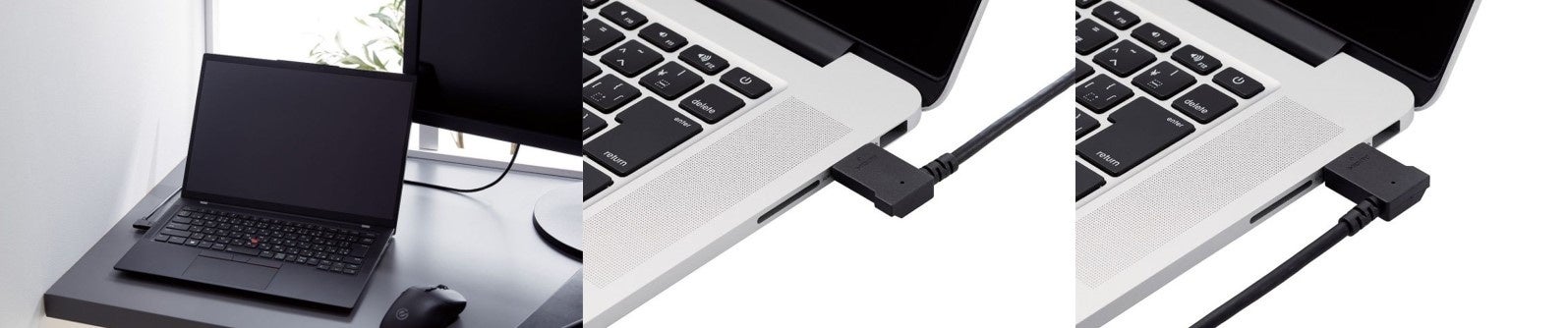 L字型のデザインでノートパソコン接続時、マウス操作をする手にケーブルが干渉せず、パソコン周りのスペースを有効に活用できます。