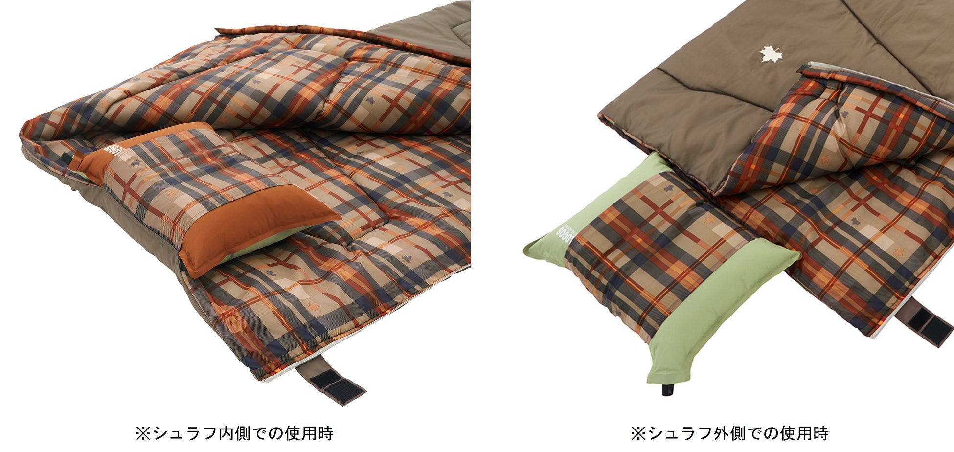 キャンプでの就寝時の悩みの1つに枕のズレがあります。キャンプ用の枕は軽くて滑りやすいものが多く、固定が難しいのが通例でしたが、本アイテムには枕ホルダーがついていることで、枕のズレを防ぎ、慣れないキャンプ場でも快適な眠りを促します。シュラフの内側でも外側でも好みに合わせて使い分けができ、別売りの「セルフインフレート まくら」がぴったりサイズでご使用いただけます。枕がなくても衣類などをホールドして枕代わりにすることも可能です。