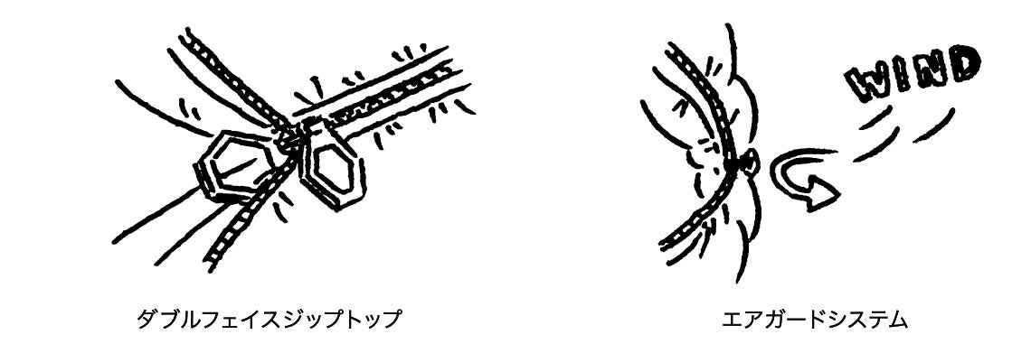 寝袋の内側と外側、どちらからでもジッパーの開閉ができる便利なダブルフェイスジップトップで、テーピングに加工より生地の挟み込みも防止。ジッパー部分にドラフトチューブを設けることで、外気流入をしっかり防止し、保温性能を高めるエアガードシステムも搭載。