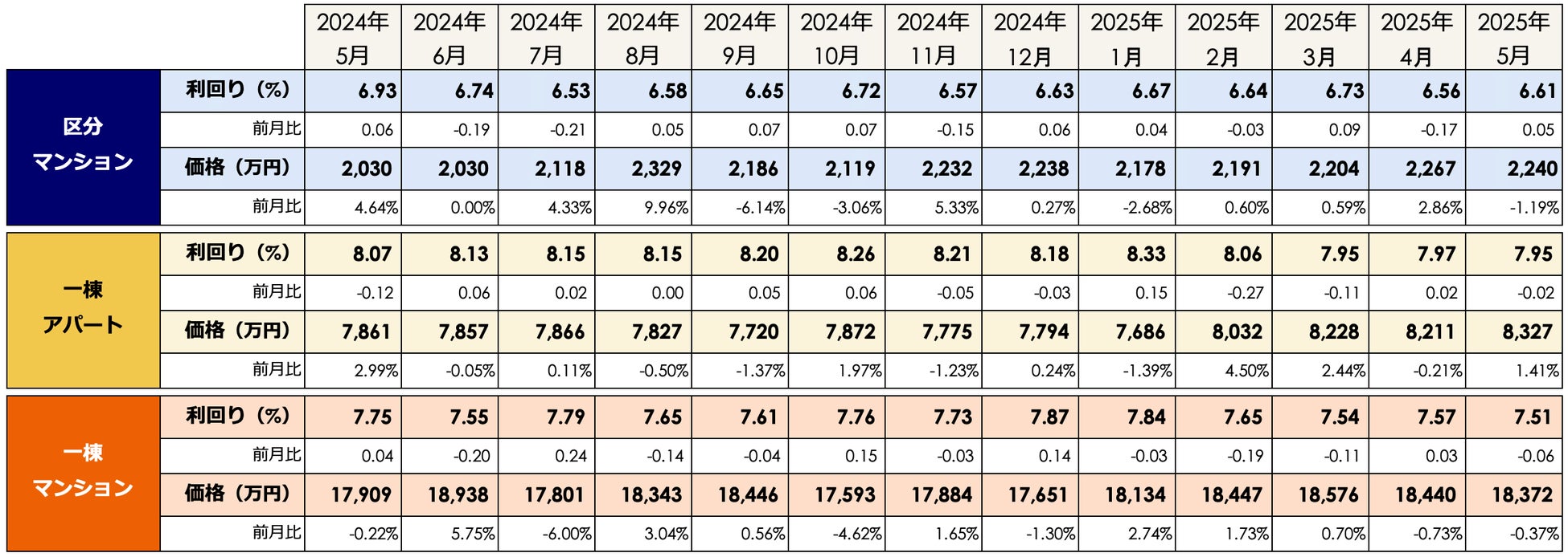 2025年5月1日~5月31日に健美家で登録・掲載された全国の住宅系収益不動産3種別(区分マンション・一棟アパート・一棟マンション)