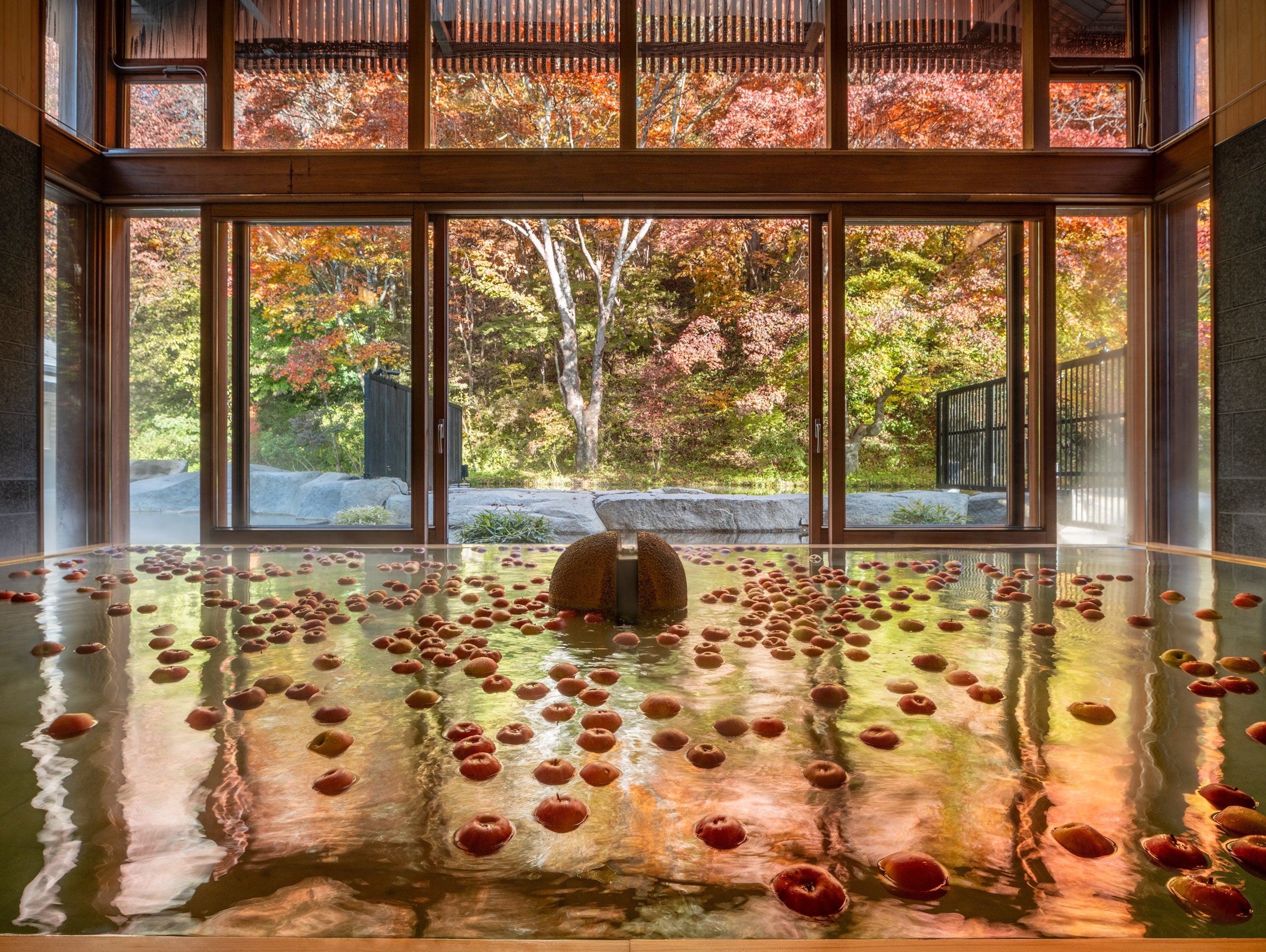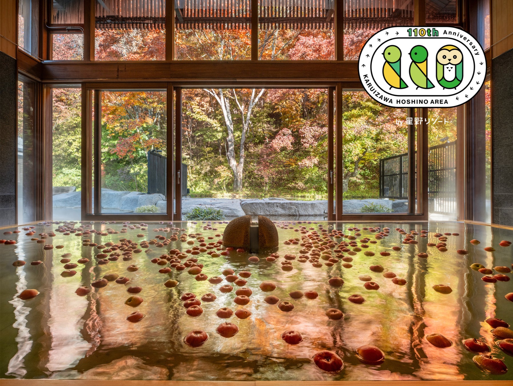 自然と文化を愛する人々が集う場所「軽井沢星野エリア」にある「星野温泉 トンボの湯(以下、トンボの湯)」では、2024年10月17日~20日と11月7日~10日に、1000個の規格外のりんごを使ったサステナブルな季節湯「りんご湯」を開催します。期間中、男女の内湯には、傷がついたり出荷には向かない、合わせて1000個もの規格外のりんごが湯船いっぱいに浮かびます。さらに今年は、使用後のりんごを堆肥化した「りんご土」で育てた「シナノスイート」を使った湯上がりスイーツが新登場。サステナブルな取り組みを感じながら、秋の軽井沢を満喫することができます。