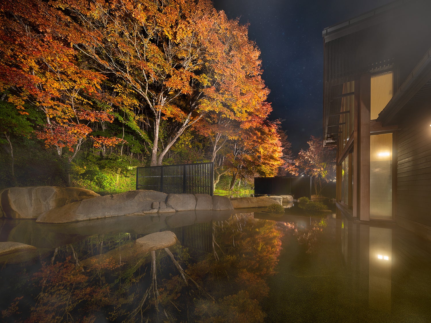 1000個の規格外のりんごを使ったサステナブルな季節湯「りんご湯」開催期間は、軽井沢の紅葉がもっともきれいな季節。期間限定で夜の時間帯でも紅葉を楽しめるようライトアップを行います。りんごの香りがいっぱいに広がる温泉から、紅葉を眺めることができます。