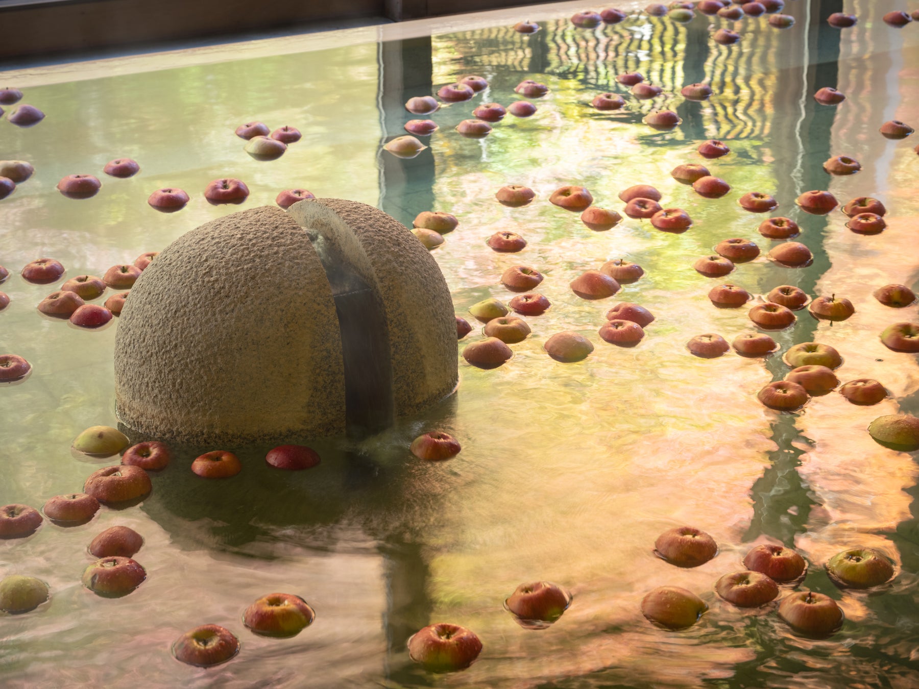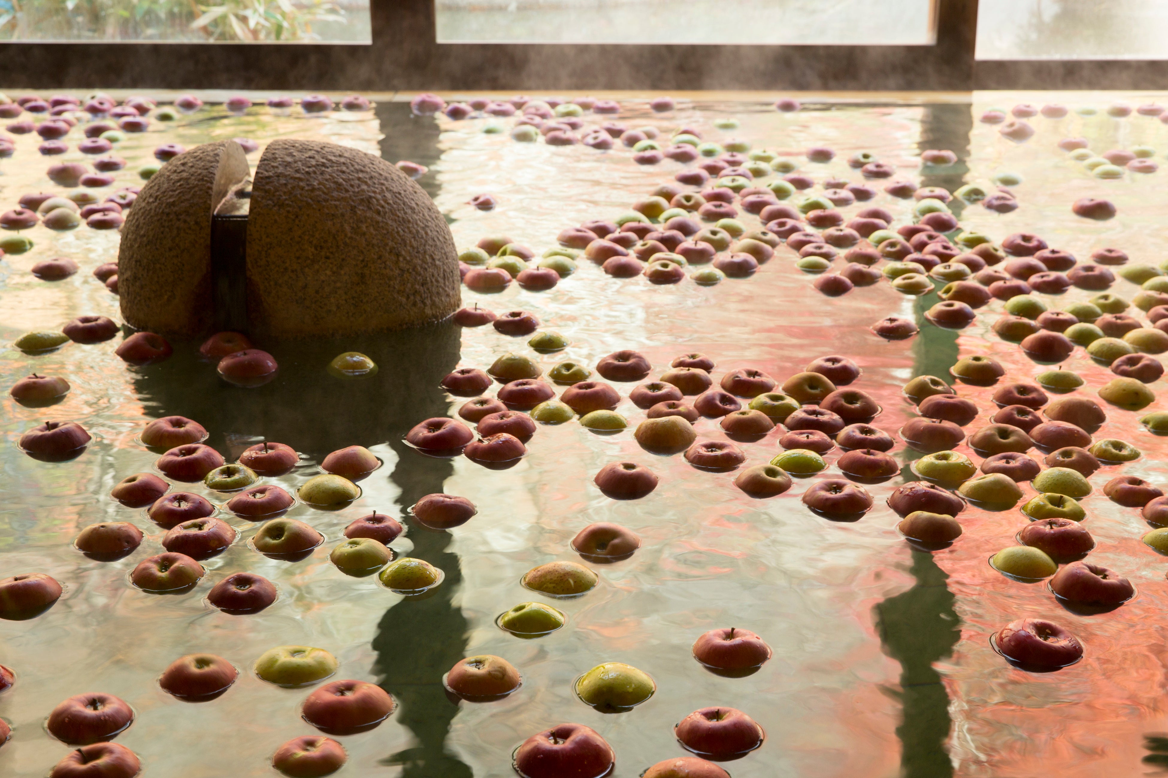 特徴1 1000個の規格外のりんごが浮かぶ、源泉かけ流しの温泉