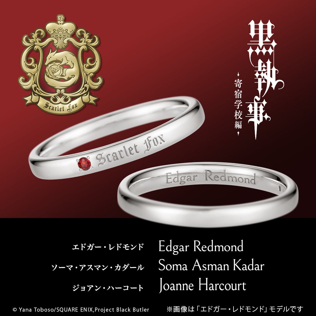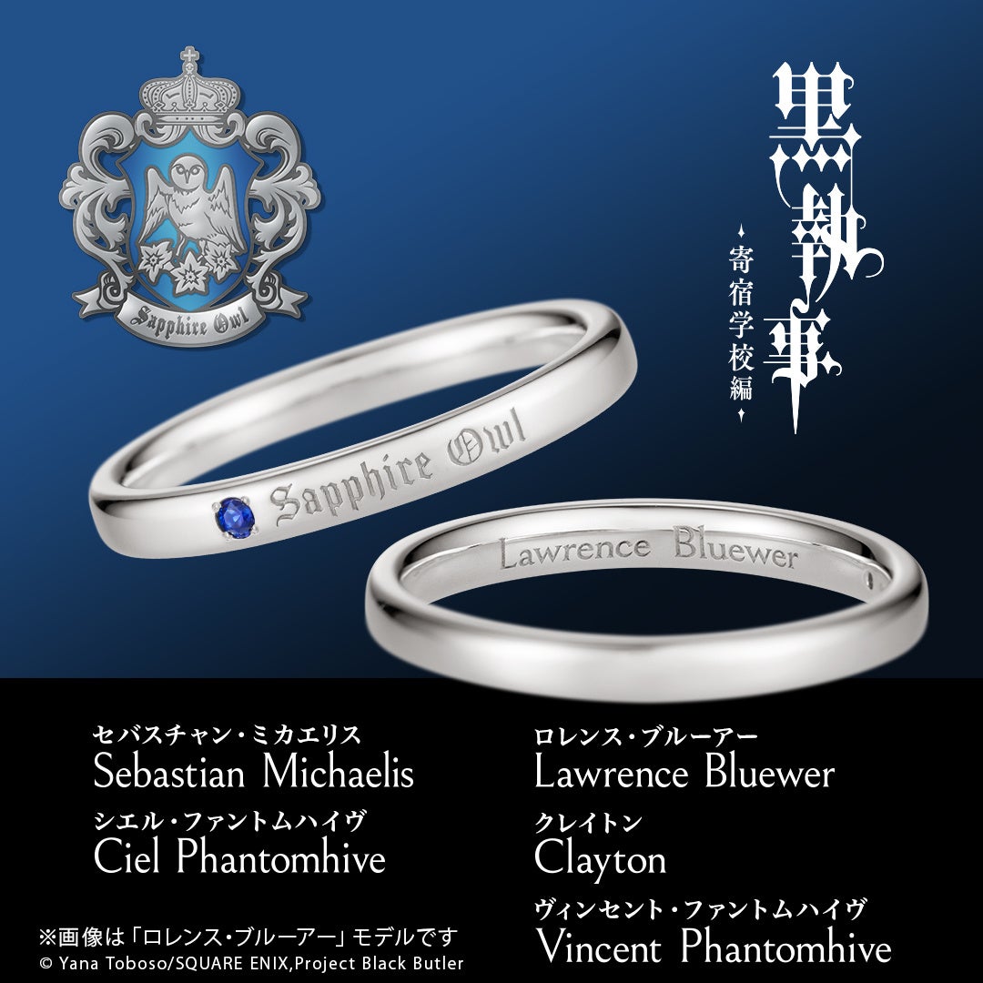 今回の新作は、【黒執事 -寄宿学校編-】に登場する、「深紅の狐(スカーレット・フォックス)寮」「紺碧の梟(サファイア・オウル)寮」「翡翠の獅子(グリーン・ライオン)寮」「紫黒の狼(ヴァイオレット・ウルフ)寮」4寮それぞれをモチーフにしたリング(指輪)です。内側には寮生/寮監の名前を刻印しました。