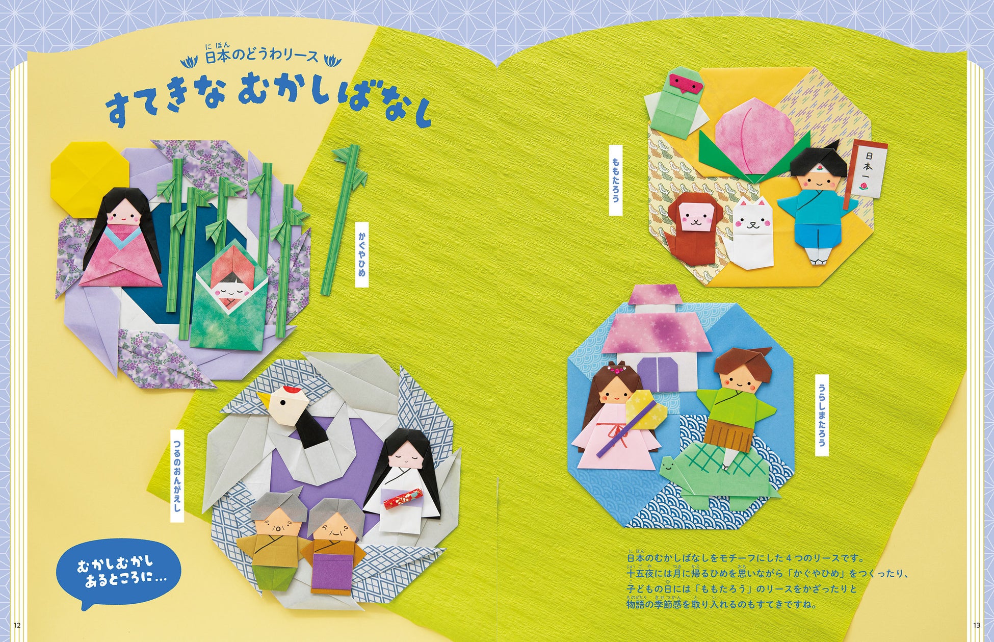 子どもの日に「ももたろう」のリースをつくったり、十五夜には「かぐやひめ」を飾ったり、物語の季節感を取り入れるのもおすすめです。