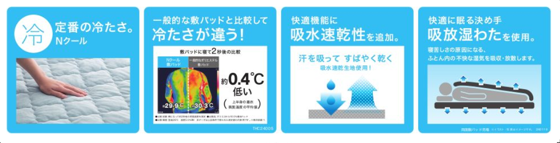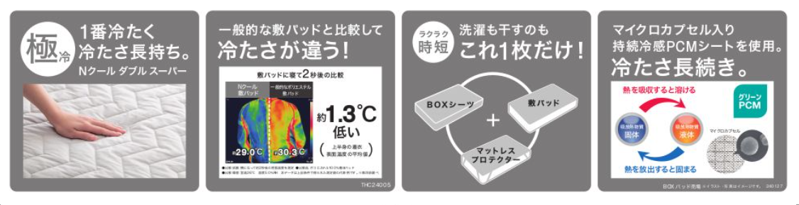 「Nクール寝具」は定番の冷たさ「Nクール」シリーズ、もっと冷たい「Nクールスーパー」シリーズ一番冷たく冷たさ長続きの「Nクールダブルスーパー」シリーズの3種類をご用意。