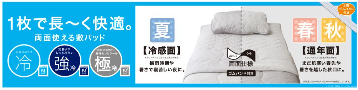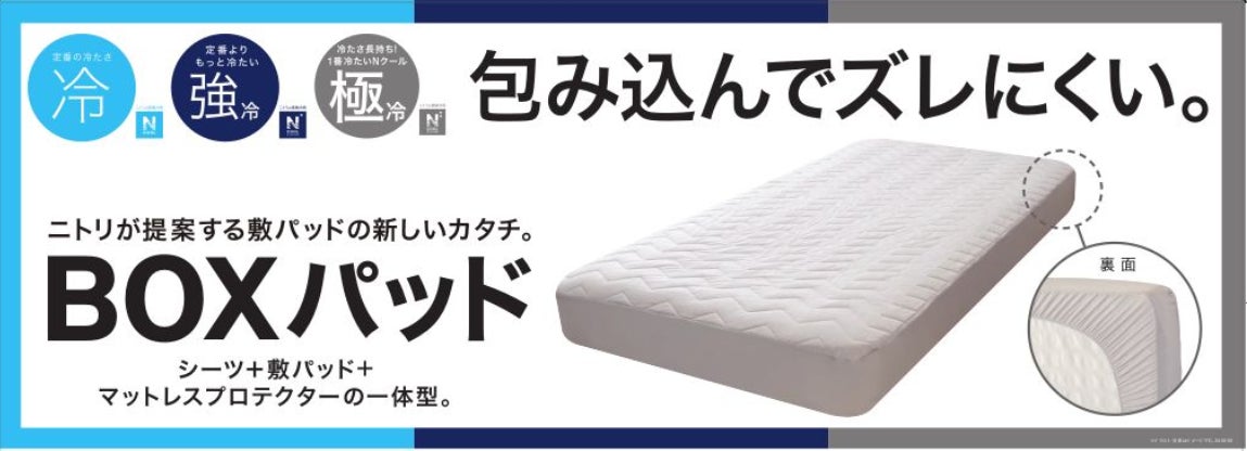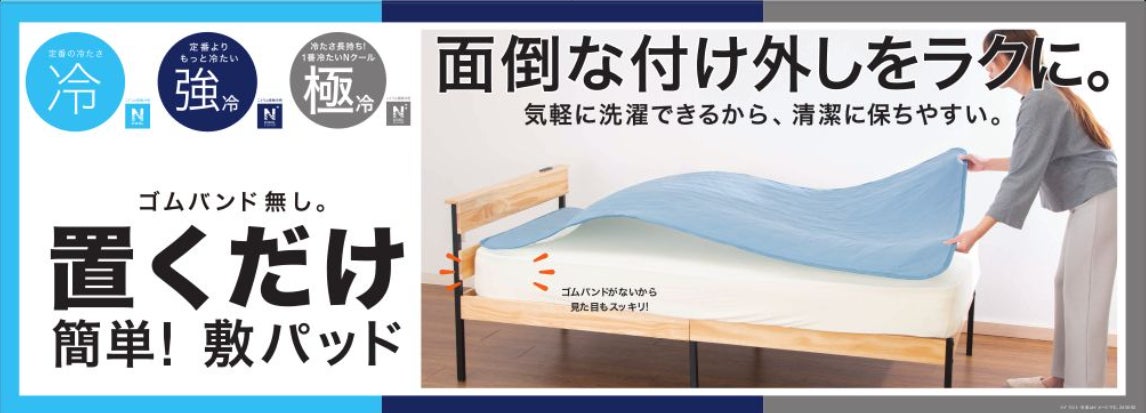 今年は多くのお客様からの要望に応え、ラインアップをさらに拡大。昨年、定番の冷たさ「Nクール」のシリーズに取り扱いがなかった、パッと置くだけで敷けて、取り外しも楽な「置くだけ簡単敷きパッド」と包み込んでズレにくく、3つの役割が1つになった「BOXパッド」を、新たに追加しました。