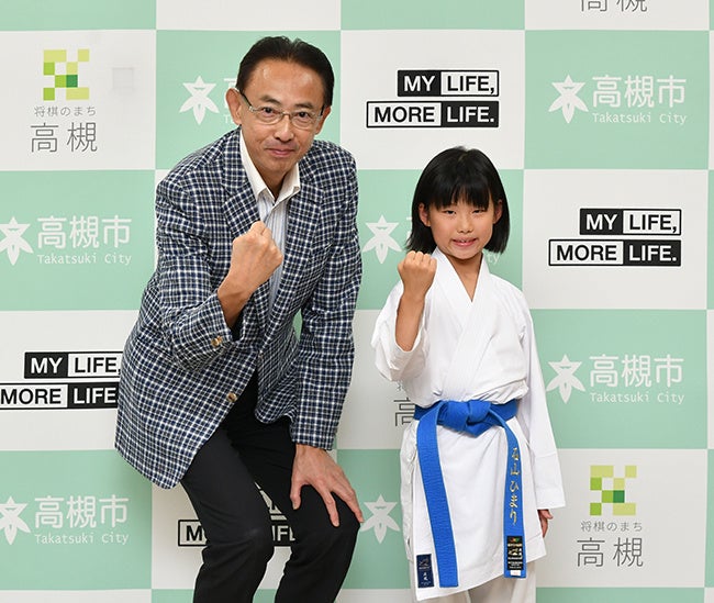 高槻市立郡家小2年の石山ひまりさんが空手道の全国大会出場を市長に報告