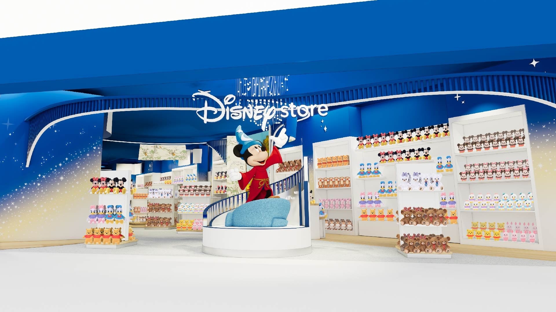 新店舗は、ディズニーの魔法で命を吹き込まれた絵本をイメージした、温かみを感じられる空間です。エントランスでは、「魔法使いの弟子」に扮したミッキーマウスのスタチューがゲストの皆さまをお迎えします。伝説のアニメーターたち“ナイン・オールド・メン”が描いたディズニーキャラクターのアートを用いた店内はファン必見です。さらに、ダンボやプーさんのぬいぐるみフォトスポットもご用意しています。たくさんのディズニーキャラクターに囲まれながらお買い物をお楽しみいただけます。