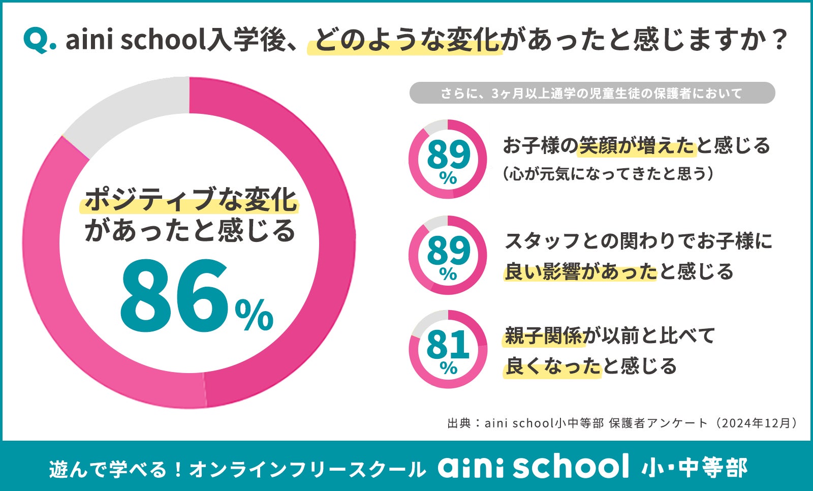 TOP3は「お子様の笑顔が増えた」「良い影響を感じる」「親子関係が良くなった」 ~aini schoolの児童生徒保護者アンケートを実施~