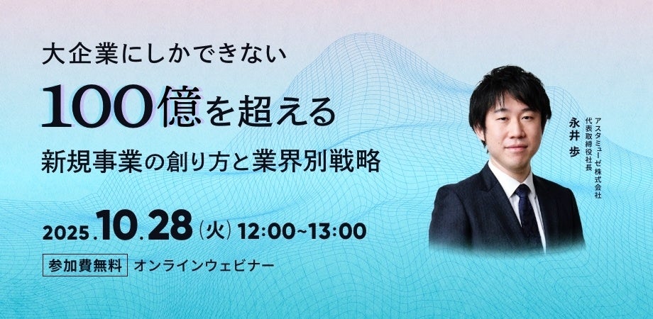 アスタミューゼ株式会社(本社:東京都千代田区、代表取締役社長 永井歩)は、2025年10月28日(火)12:00-13:00に、無料ウェビナー「大企業にしかできない100億を超える新規事業の創り方と業界別戦略」を開催いたします。失敗・課題を解決する方法や取り組み事例について具体的にご紹介致します。