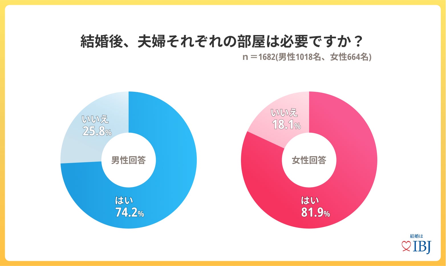 結婚後、夫婦それぞれの部屋が必要か伺うと、男性74.2%、女性81.9%が「必要」と回答する結果に。