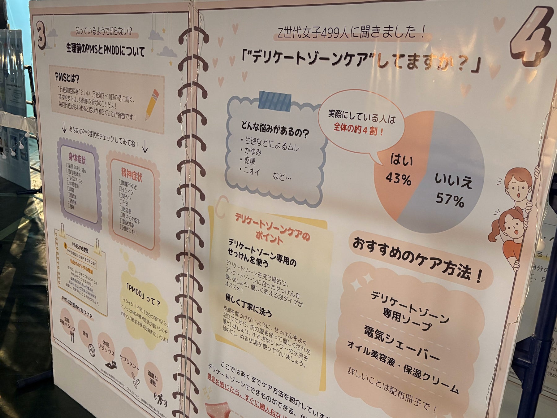 産学連携プロジェクトでは、調査で収集したリアルな声をもとに「デリケートゾーンケアアイテムのプロモーション立案」も進行し、ゼミ生はZ世代へ興味を喚起できるPR施策を提案。2025年3月2日(日)には、日本最大級のファッションイベント「KANSAI COLLECTION 2025 SPRING&SUMMER」(開催場所:京セラドーム大阪)にブースを出展。これまでの取組内容を展示し、ゼミ生がフェムケアの重要性をZ世代の女性たちに向けて発信しました。参加したゼミ生からは「プロジェクトを通してデリケートゾーンケアについて気軽に話せるようになった」「自分のからだやこころに向き合い、自分を大切にすることの重要性に気づいた」などの声が寄せられました。