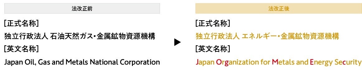 JOGMECの業務に水素や風力に関する業務が追加されること等を踏まえ、JOGMECの正式名称を「独立行政法人 エネルギー・金属鉱物資源機構」に変更します。また、英文名称についても「Japan Organization for Metals and Energy Security」へ変更します。