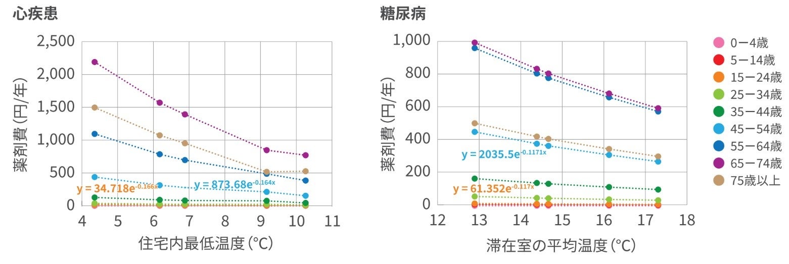 心疾患と脳血管疾患については、住宅内の温度差が一要因となることから非暖房室(浴室やトイレなど)の最低温度を基に、その他の8疾患については居間や寝室などの滞在室の平均温度を基に、調剤薬局薬剤費の期待値(※3)を推定しました。以下に、心疾患と糖尿病の住宅内温度と調剤薬局薬剤費の関係グラフ、および推定式を示します。