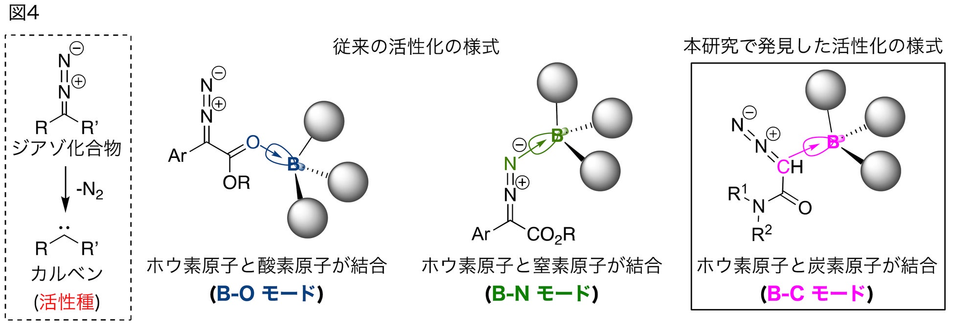 さらに同研究グループは、DFT計算(注5)を用いて開発した反応のメカニズムを解析しました。解析の結果、これまでに提唱されていなかった新しい活性化モードが発見されました。本反応ではジアゾ化合物がホウ素触媒により活性化され、鍵となる中間体(カルベン(注6))へと変換されます。過去には、ホウ素と酸素が結合を作る様式(B-Oモード)、ホウ素と窒素が結合を作る様式(B-Nモード)が報告されていましたが、本反応ではホウ素と炭素が結合を作る様式(B-Cモード)を経由していることがわかりました(図4)。この活性化モードは通常、多くの電子を持つ金属触媒がジアゾ化合物を活性化する際の様式であることが知られています。そのため電子の少ないホウ素触媒が同様の活性化モードを形成することは革新的な発見であり、この知見を踏まえた新しい反応や分子の設計が可能となることから、ホウ素化学および物質合成などの他の領域への波及効果が期待できます。